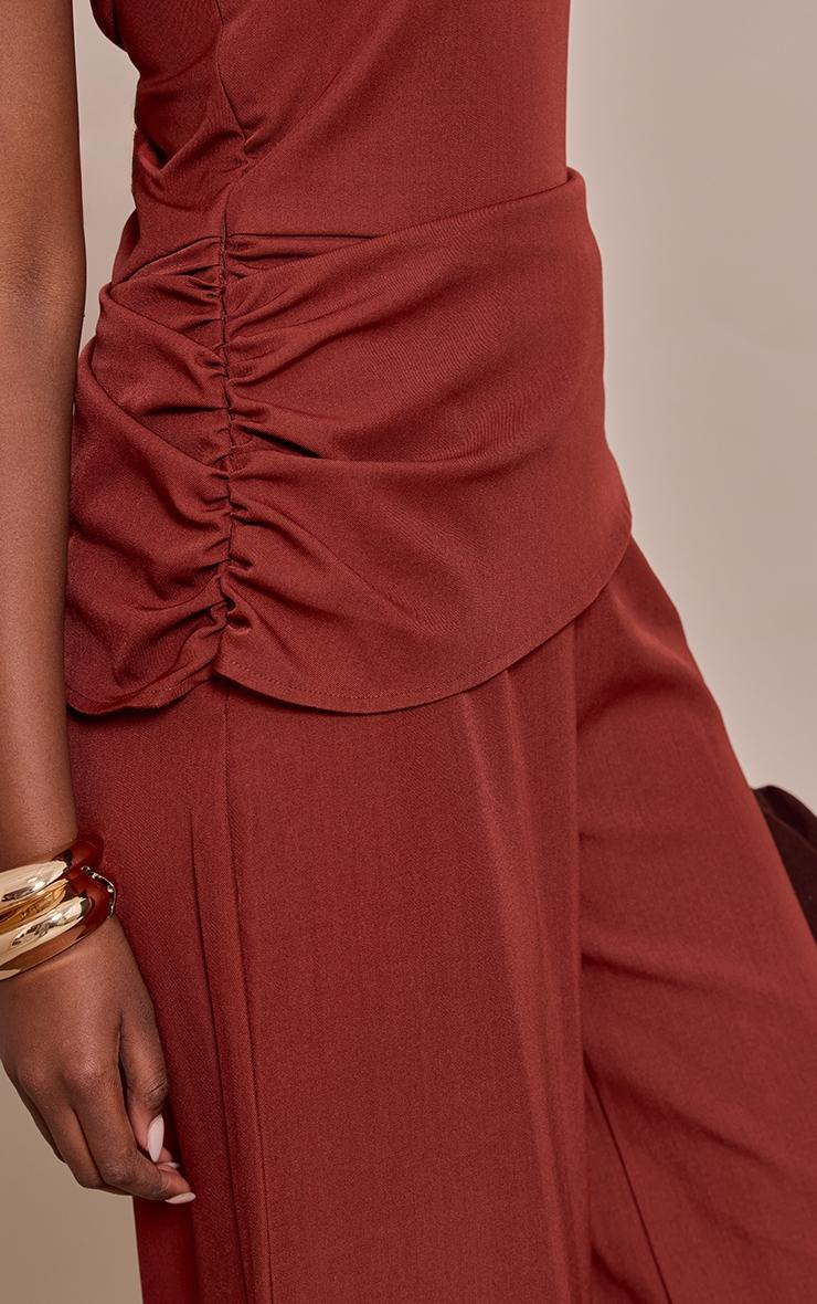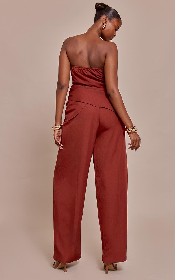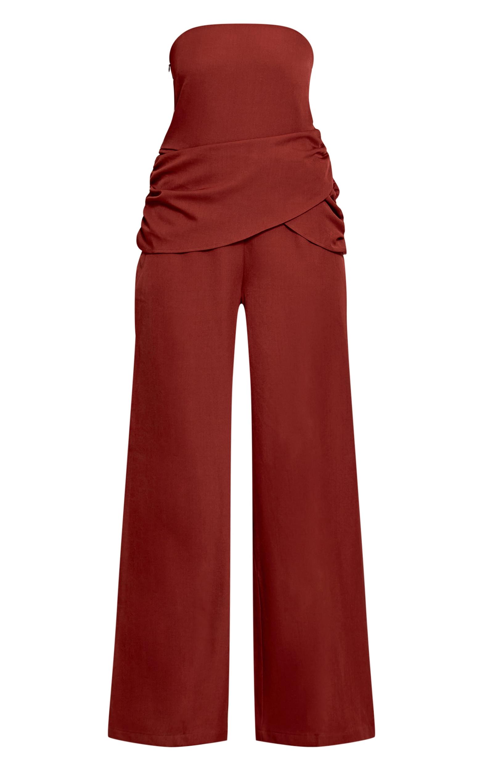 Bold and modern, the burnt orange woven bandeau draped wide leg jumpsuit is designed to make an entrance. The strapless bandeau bodice offers a clean, structured shape, while the draped overlay detail at the waist adds movement and dimension. Flowing into a wide leg cut, this jumpsuit elongates the figure and works beautifully with statement earrings and metallic heels for a stand-out event outfit.Length approx 145cm/57inch (Based on sample size US 4)Model wears size UK 8/ EU 36/ AUS 8/ US 4Model Height - 5ft 9inchp]:!mb-4inch>Category: DressesProduct type: Wide Leg JumpsuitColor: Burnt OrangeMaterial: Tailored WovenOccasion: Evening