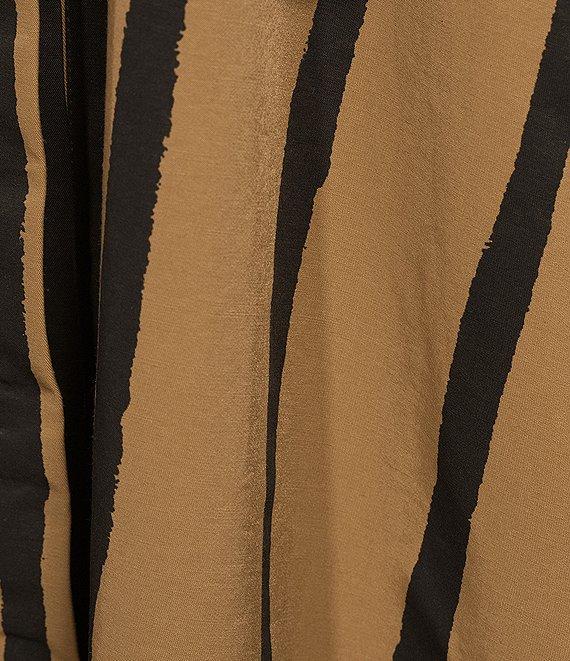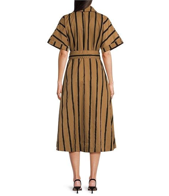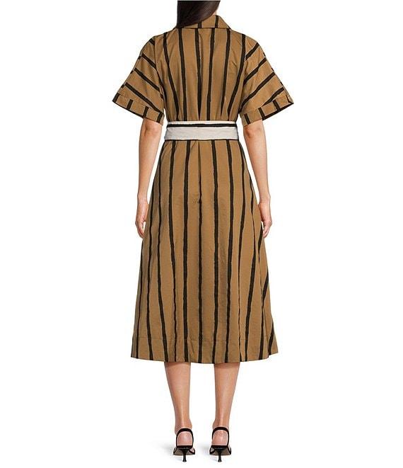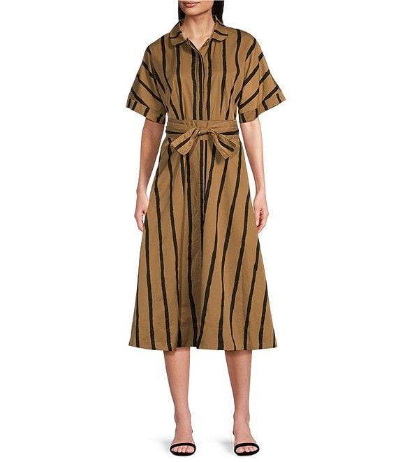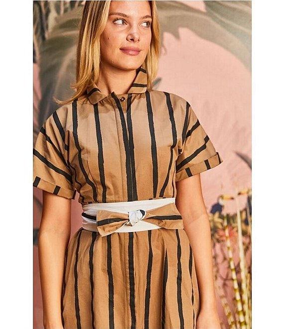 From Buru, this dress features: Vertical khaki stripe printA-Line shirt dress silhouettePointed collar neckline Elbow length sleevesSide seam pocketsContrast bow belt detail Fully linedMidi lengthButton front closureApprox. 46.5" length (size small for reference)Cotton/nylon; polyester liningGently hand wash with cool water/hang on line in shade to dryImported.