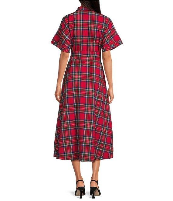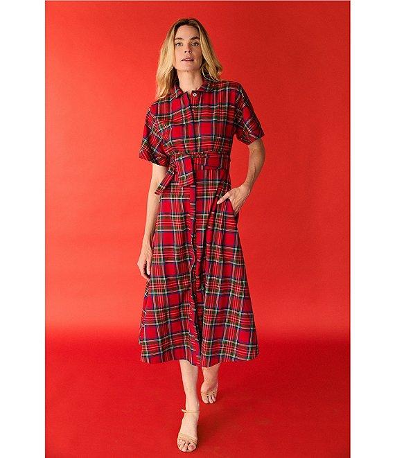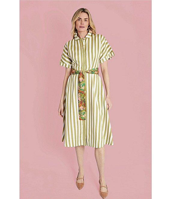 From Buru, this dress features:Vertical khaki stripe printA-Line shirt dress silhouettePeter pan collarShort sleevesSide seam pocketsContrast bow belt detail Fully linedMidi lengthButton front closureApprox. 46.5" length (size small for reference)Cotton/silk; cotton liningGently hand wash with cool water/hang on line in shade to dryImported.