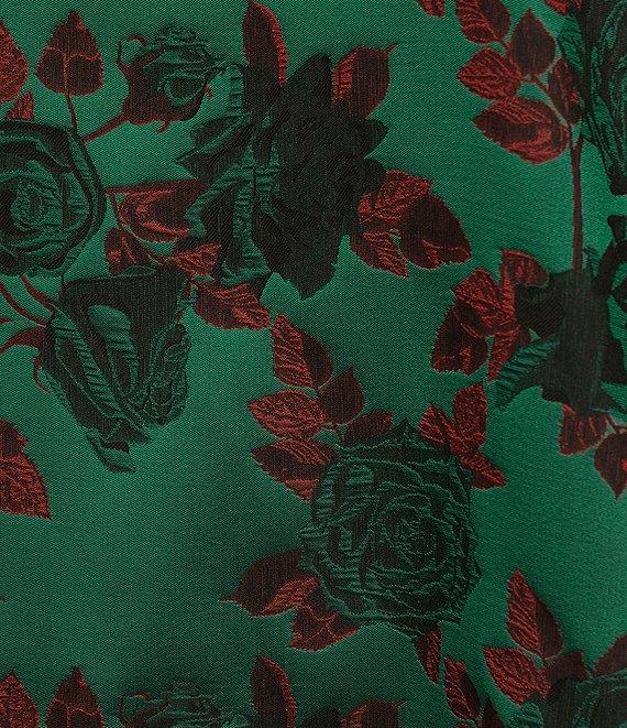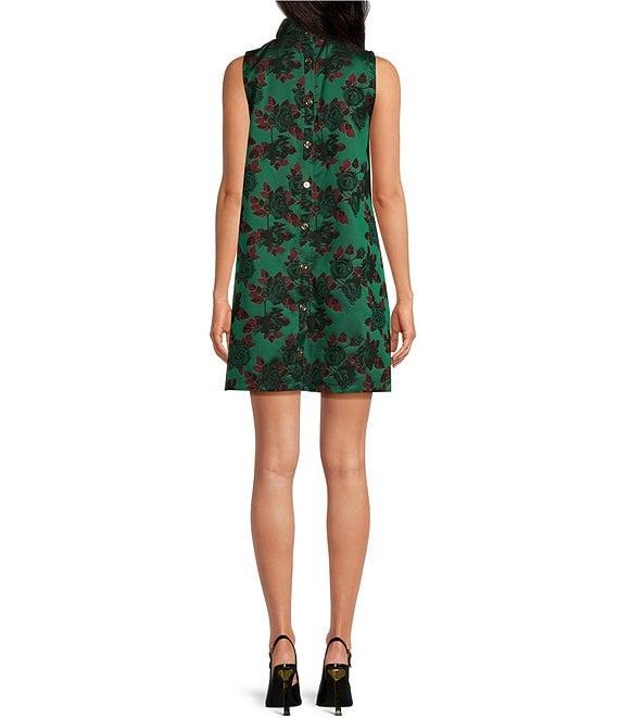 From Buru, this dress features: Floral brocade fabrication Shift silhouette Modern fit Mock neckline Sleeveless Side seam pockets Fully lined Straight hemline Pull-on construction Full button back closure Mini length Approx. 34.5" length Polyester Gently hand wash in cool water/line dry Imported.