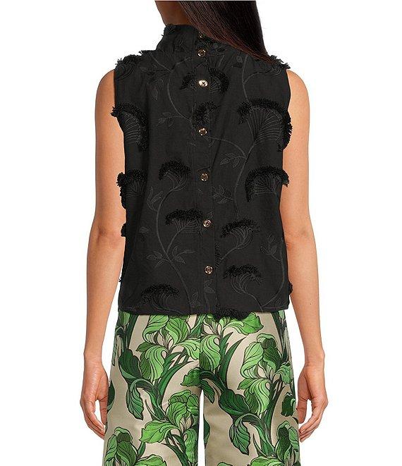 From Buru, this top features: 3D embroidered/textured fabric Mock turtleneck Sleeveless Boxy fit Cropped length Lined Button enclosure in back Approx. 18" in front length (size xs) Cotton Hand wash cold/hang to dry Imported.
