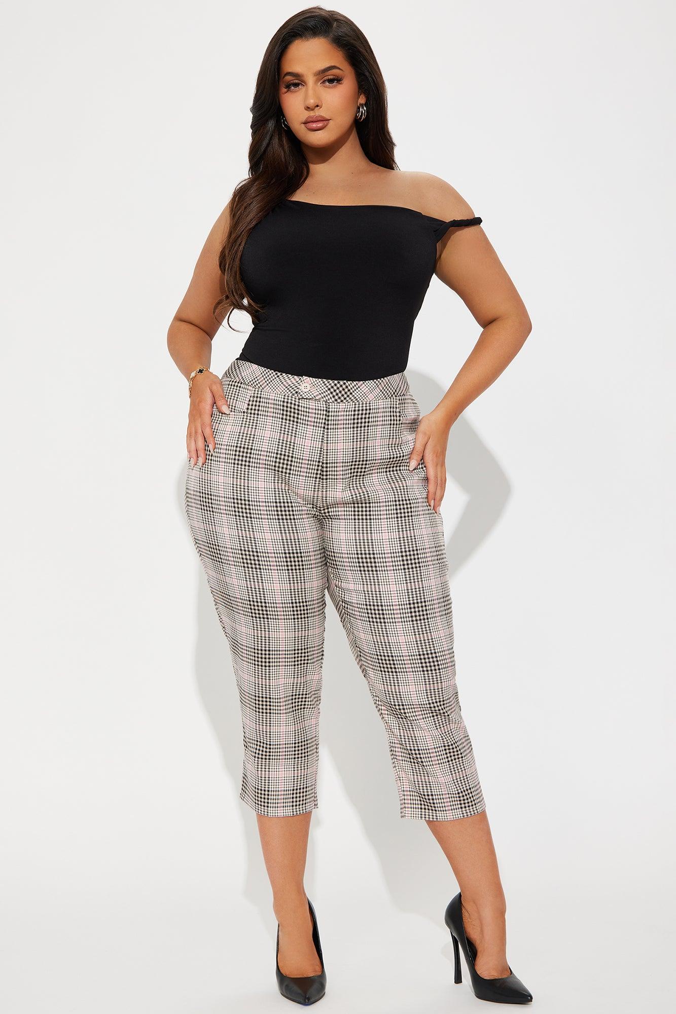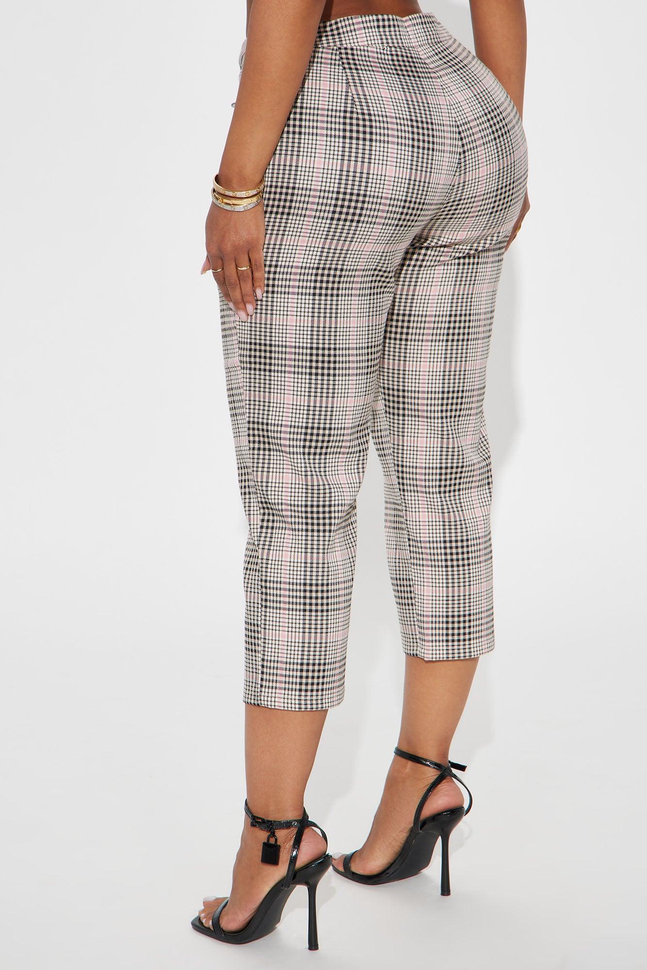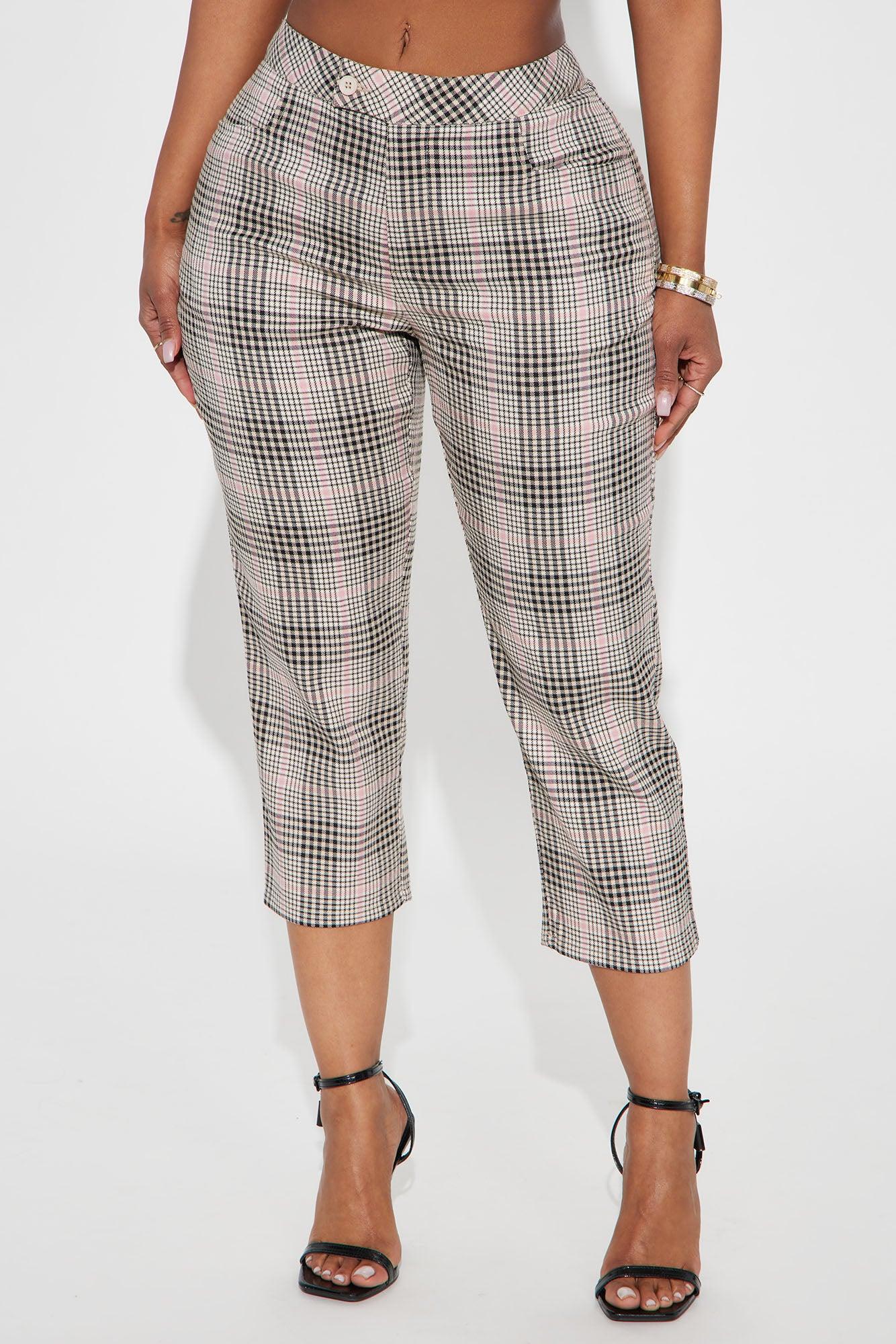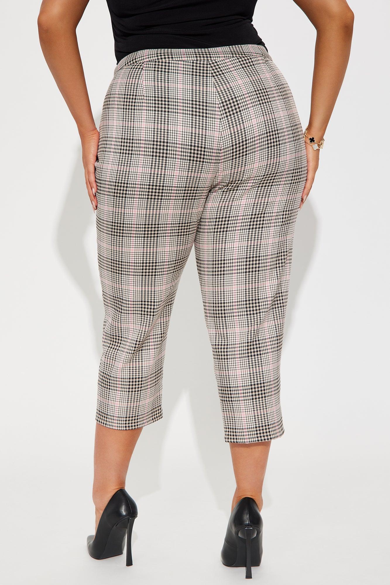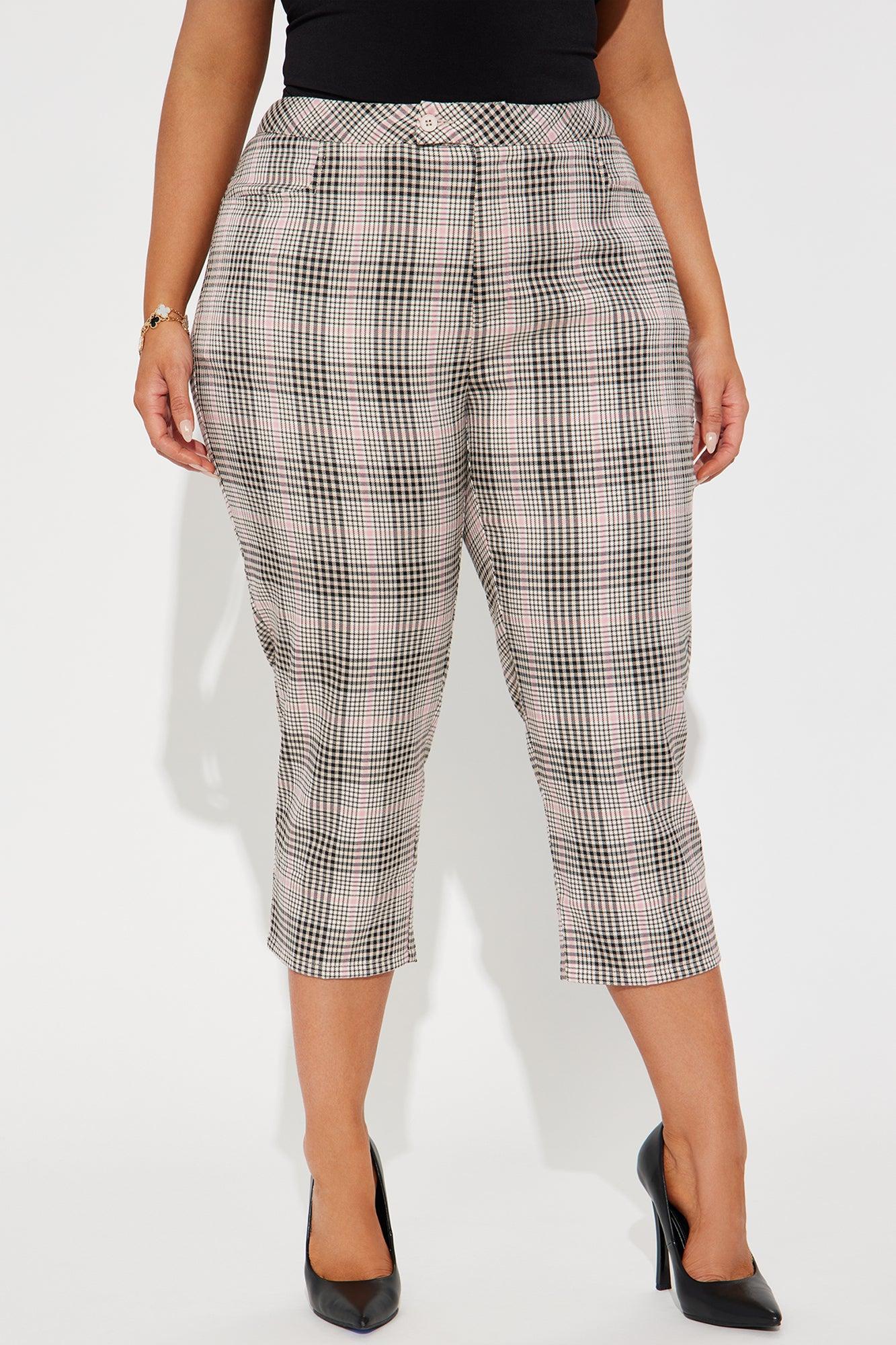 Available In Brown, Mauve, And Black. Capri Pant Mid Rise Double Button & Zip Closure Plaid Non Stretch 19" Inseam Self: 98% Polyester 2% Spandex Imported California Proposition 65 WARNING: Cancer and Reproductive Harm - www.P65Warnings.ca.gov.