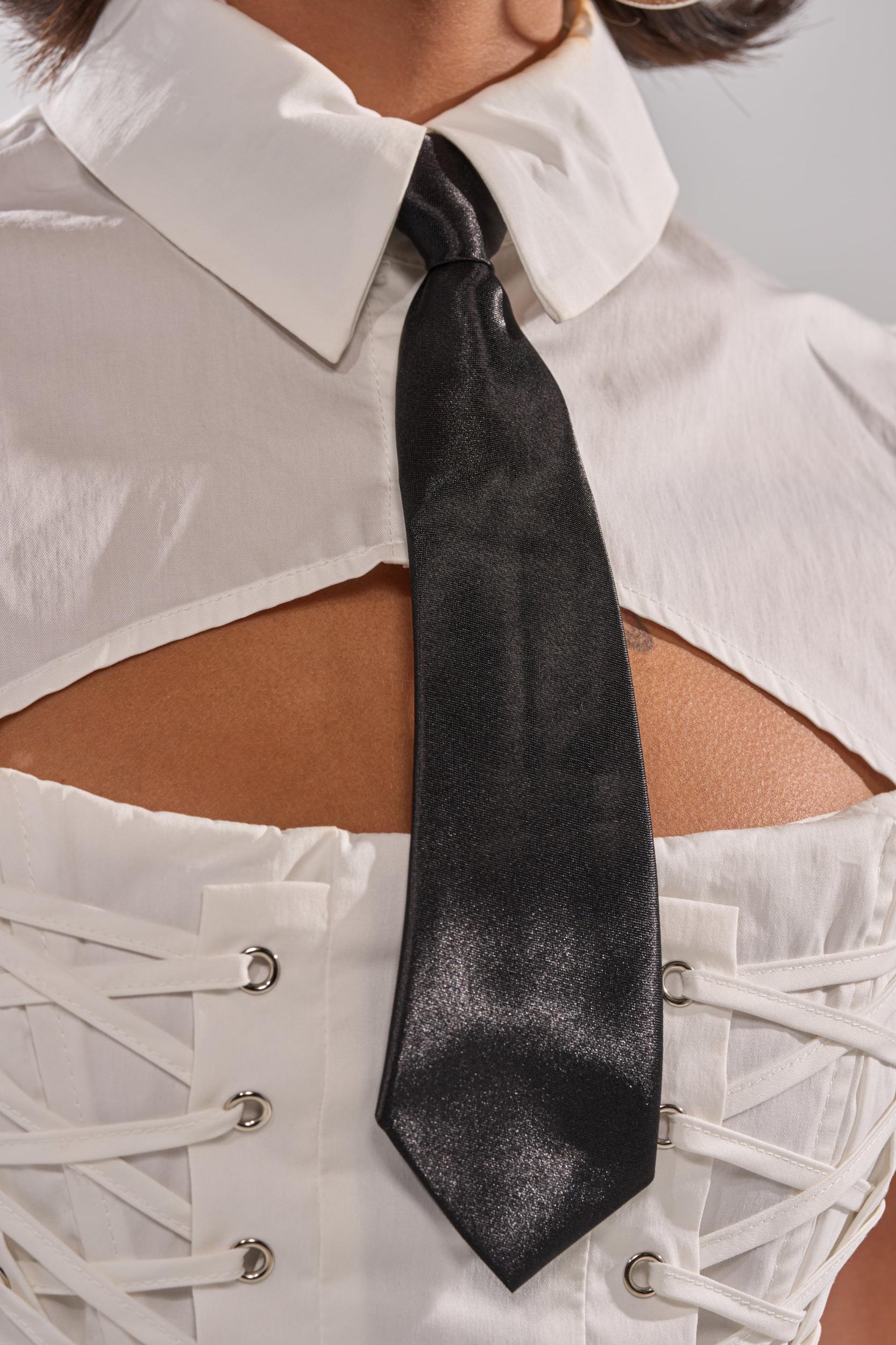 The AKIRA Label Business Only Blouse is your new uniform for getting things done in style. Crafted from a crisp cotton-blend fabric, this top features a pointed collar with an adjustable black necktie, short sleeves, a half-panel of button front closures that leads into a sultry cut-out chest accent, and panels of lace-up detailing on the lower bodice that sculpts the waist. Pair with satin trousers and kitten heels for a femme fatale finish. - Shell: 60% Cotton 35% Nylon 5% Spandex, Lining: 5% Spandex- Some Stretch- Imported (all measurements approximate from size small)- 21” Shoulder to Hem- 12” Shoulder to Shoulder- 9” Sleeves- Model is 5’7” and is wearing size smallProduct ID: 1074434 (all measurements approximate from size 1X)- 24” Shoulder to Hem- 15” Shoulder to Shoulder- 10” SleevesProduct ID: 1074438
