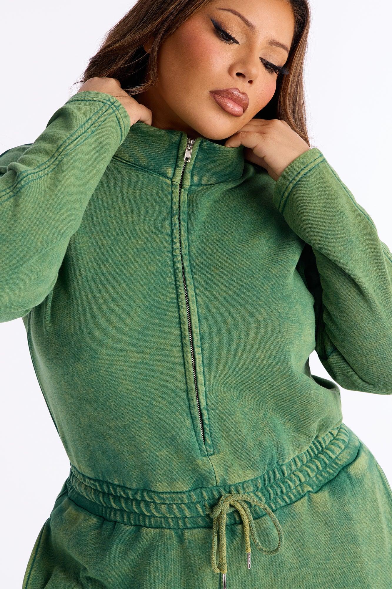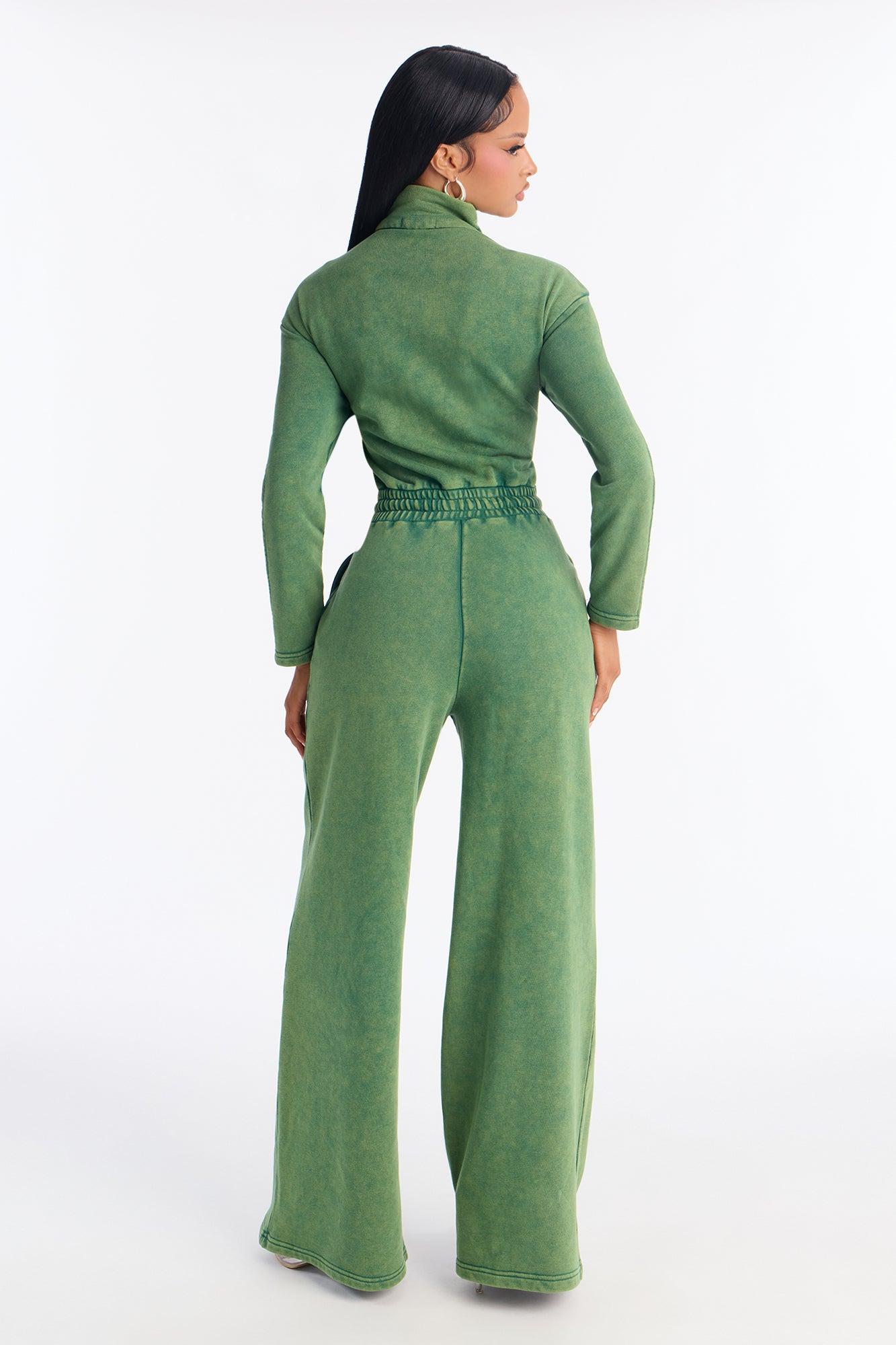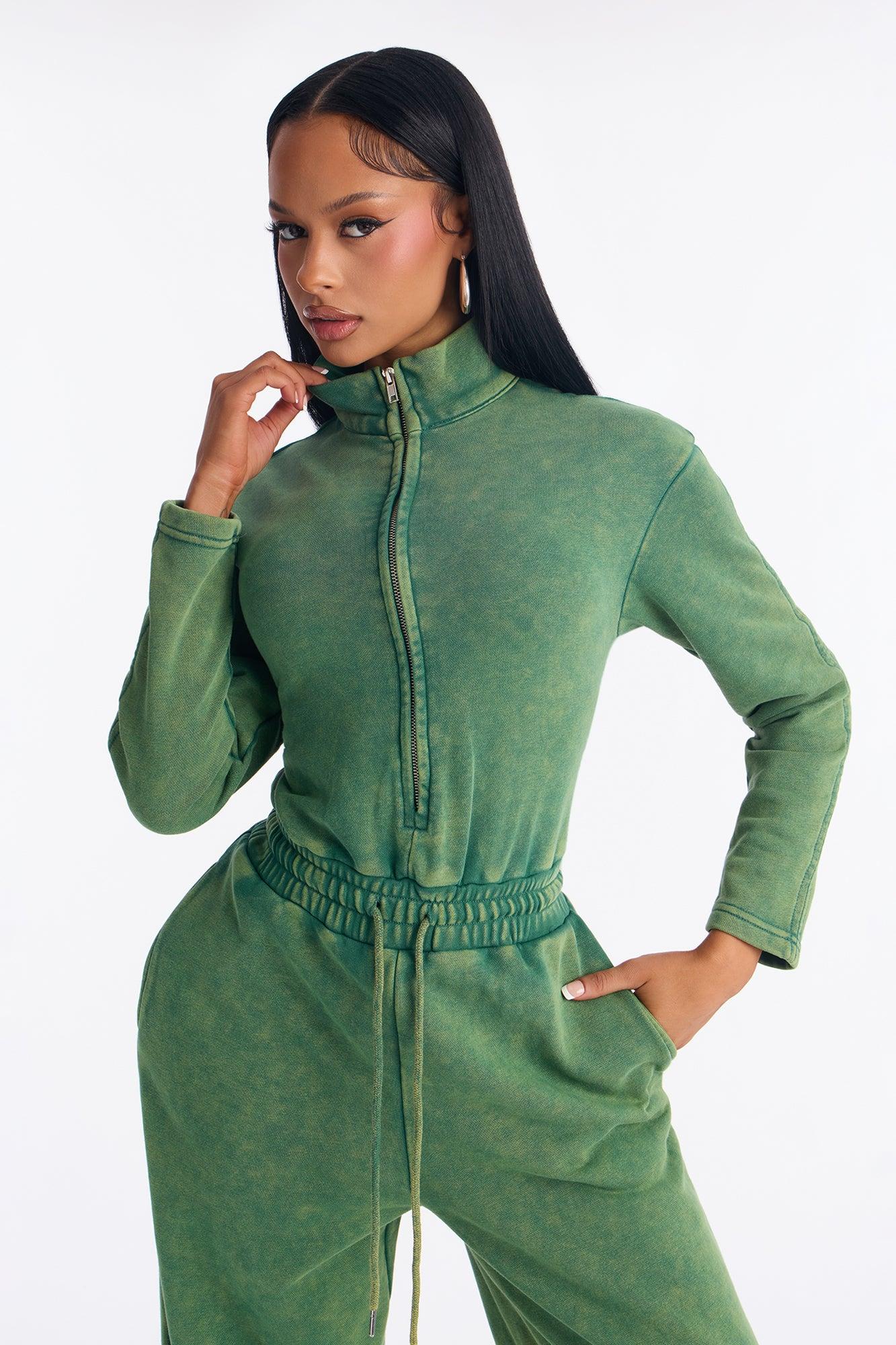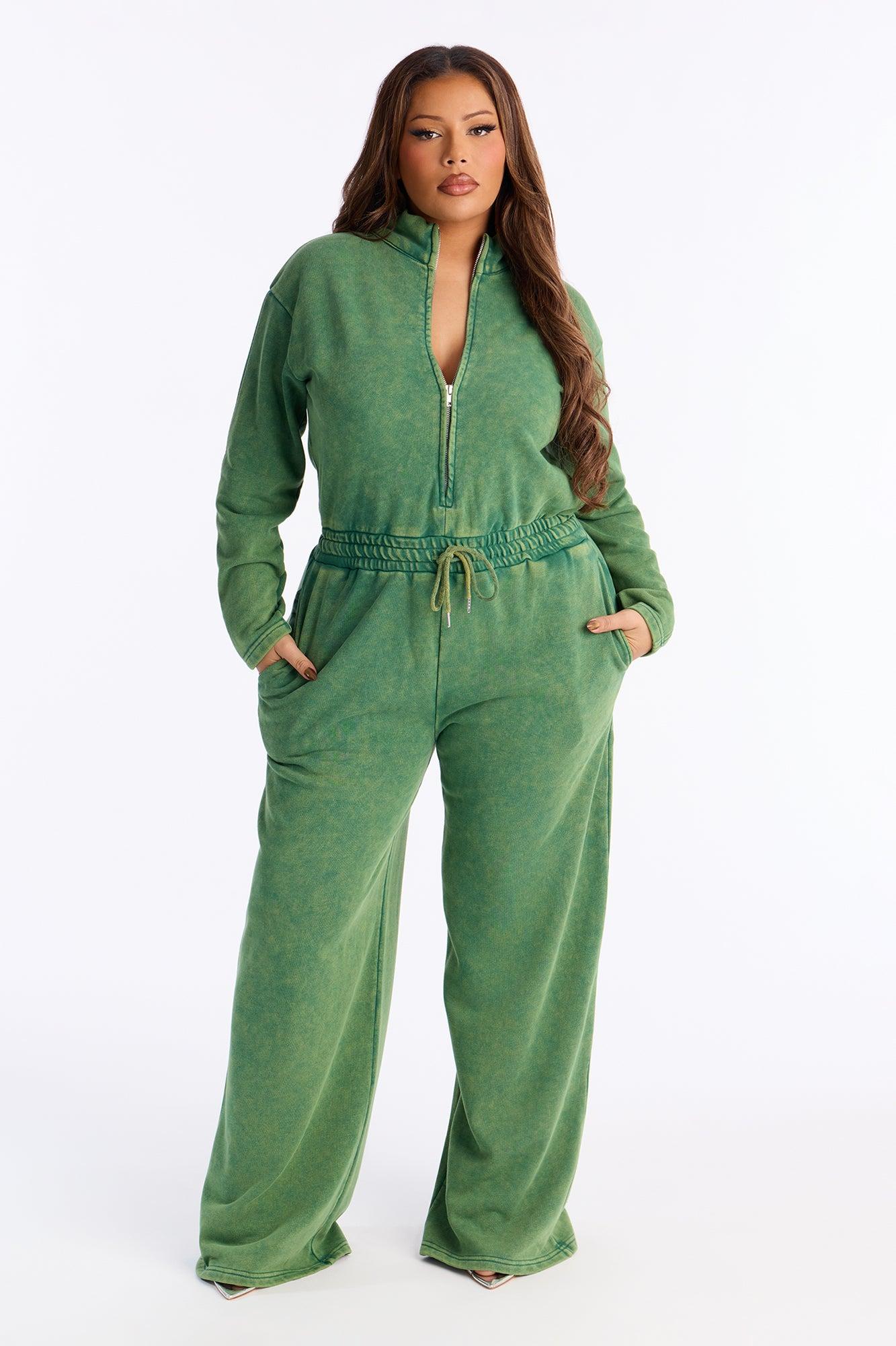 Available In Charcoal, Hunter And Navy. Jumpsuit Stretch Long Sleeve Zip Up Elastic Waistband Pockets Wide Leg 32" Inseam Disclaimer: Due To The Specialized Wash Process, Each Garment Is Unique. Self: 85% Cotton 15% Polyester Imported California Proposition 65WARNING: Cancer and Reproductive Harm - www.P65Warnings.ca.gov.
