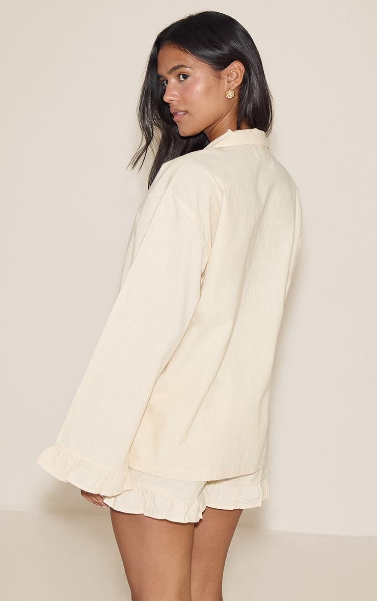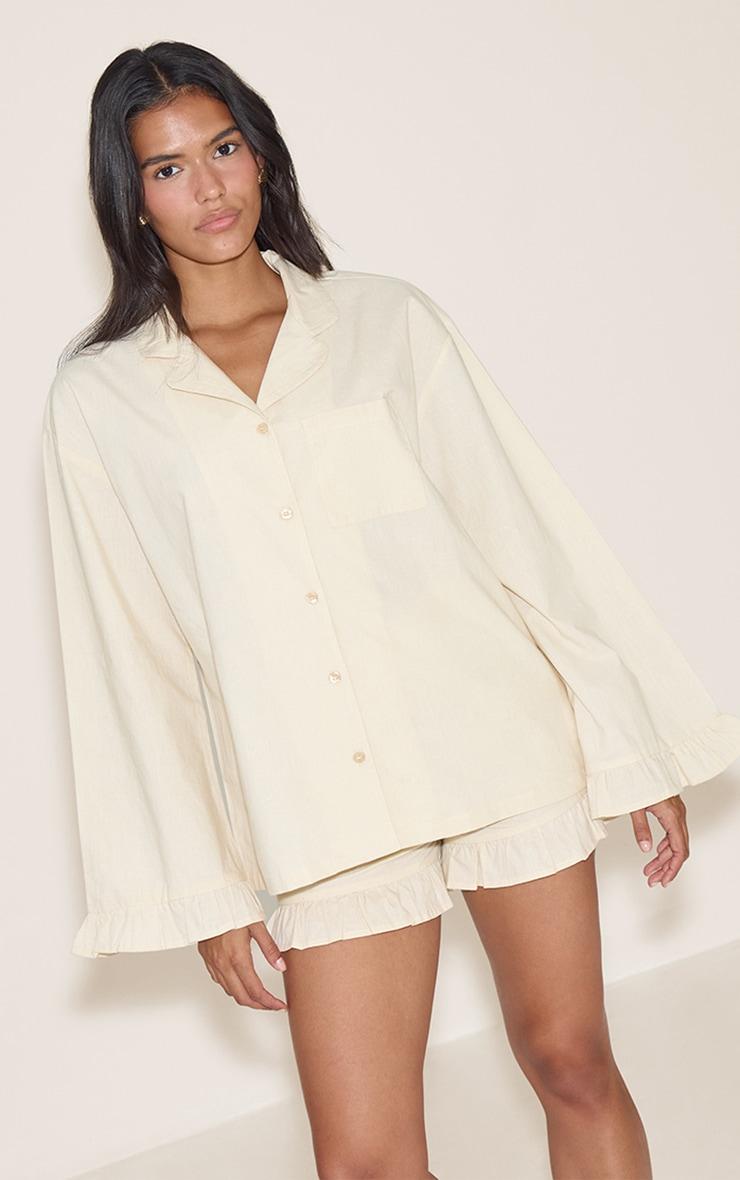 Embrace the moments of effortless ease. The butter cream cotton poplin frill hem short pj set offers refined comfort for unwinding. The classic shirt features a sharp collar and button front, paired with simple shorts finished with a delicate frill hem detail. Curl up in this set with soft slippers and your favorite book. Top length approx 48cm/19inch Bottoms length approx 38cm/13inch (Based on sample size S)Model wears size SModel Height - 5ft 7inchp]:!mb-4inch>Brand: PrettyLittleThingCategory: Lingerie & NightwearProduct type: Short PJ SetColor: Butter CreamMaterial: Cotton Poplin