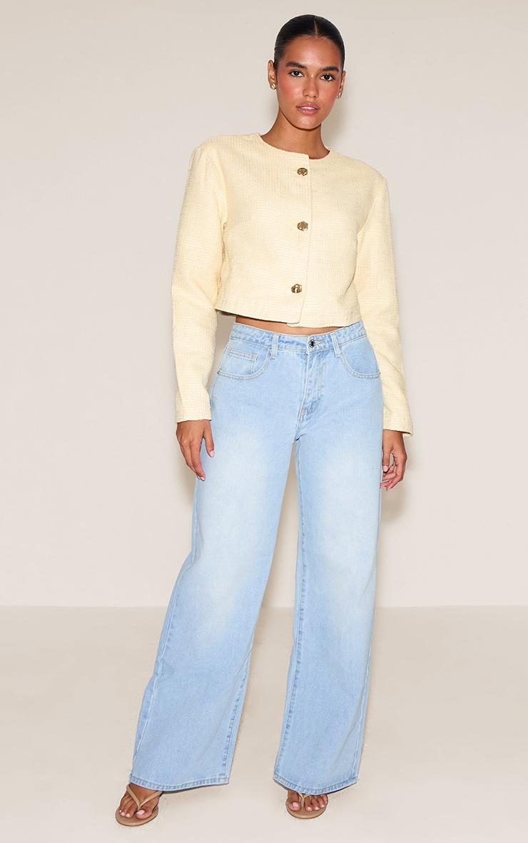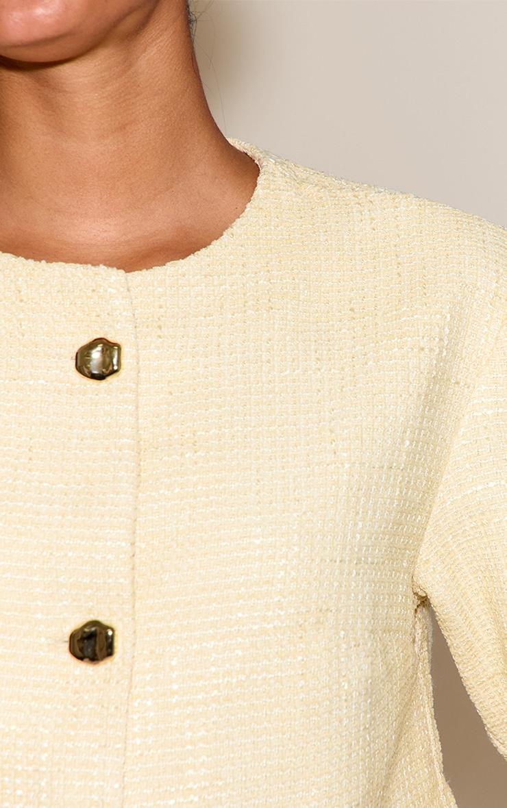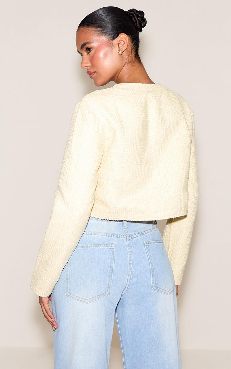The butter cream cropped button up tweed collarless jacket blends classic tailoring with a modern silhouette through its cropped cut and luxurious tweed texture. The collarless neckline offers a clean, refined finish. Team it with wide-leg jeans and heeled sandals for a sophisticated office-ready outfit.Length approx 38cm/15inch (Based on sample size US 4)Model wears size UK 8/ EU 36/ AUS 8/ US 4Model Height - 5ft 7inchp]:!mb-4inch>Brand: PrettyLittleThingCategory: OuterwearProduct type: JacketColor: Butter CreamMaterial: Woven JacquardOccasion: Day