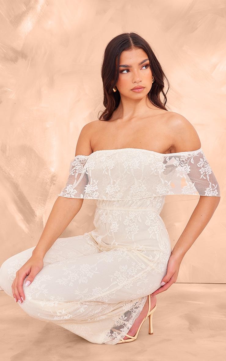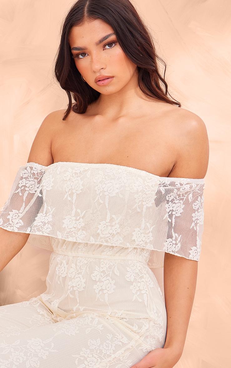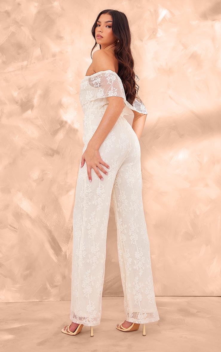 You are guaranteed to make heads turn in this butter cream shimmer floral lace bardot jumpsuit. Brought to you in a butter cream shimmer plisse material with a bardot neckline and a flattering fit, how can you not fall in love? Style this bardot jumpsuit with heels and some glam accessories for an occasion look to be remembered. Length approx 145cm/57inch (Based on a sample size UK 8) Model wears size UK 8/ EU 36/ AUS 8/ US 4Model Height - 5ft 8inchp]:!mb-4inch>Brand: PrettyLittleThingCategory: Jumpsuits & PlaysuitsProduct type: Wide Leg JumpsuitColor: Butter Cream..Material: PlisseOccasion: Evening