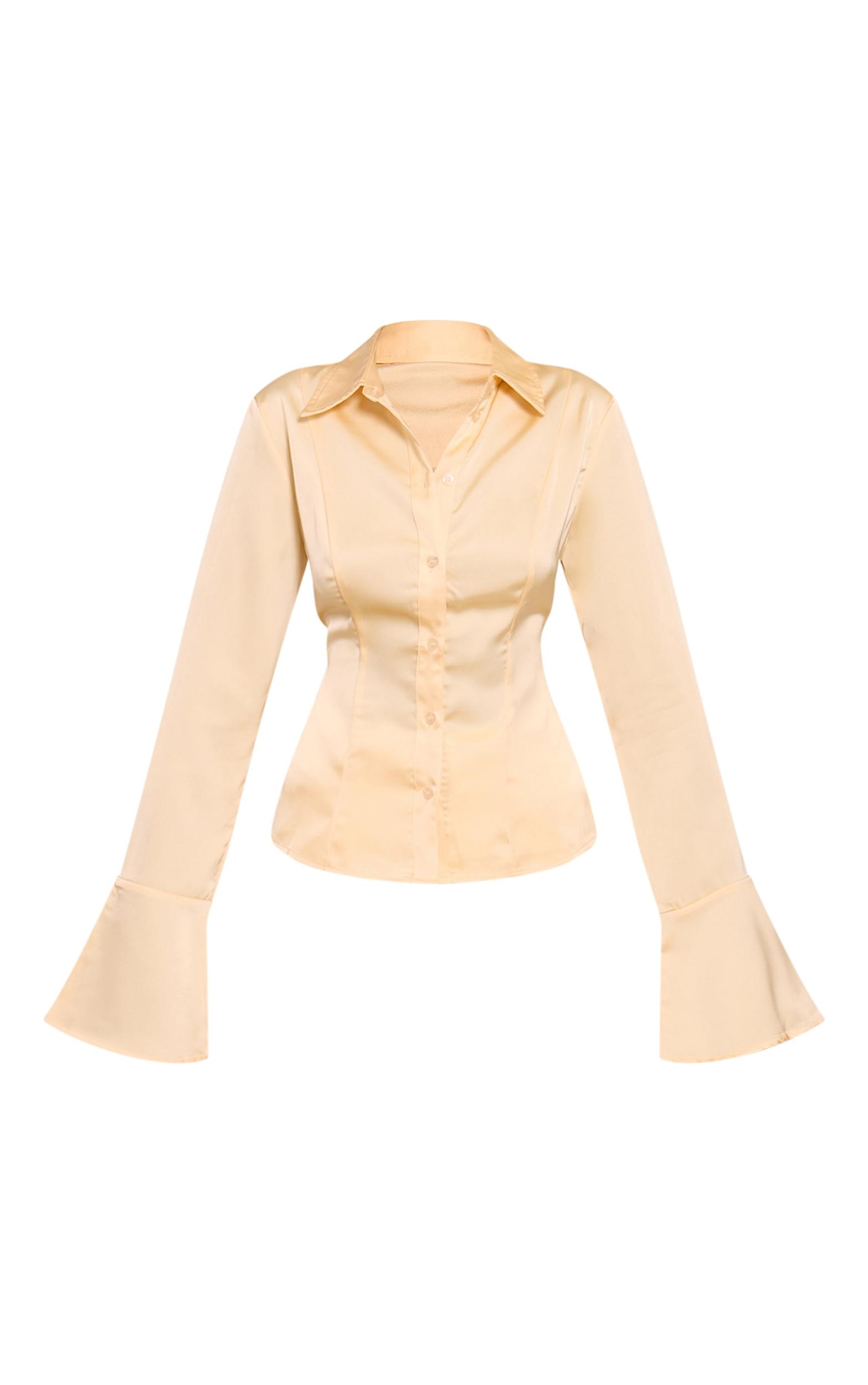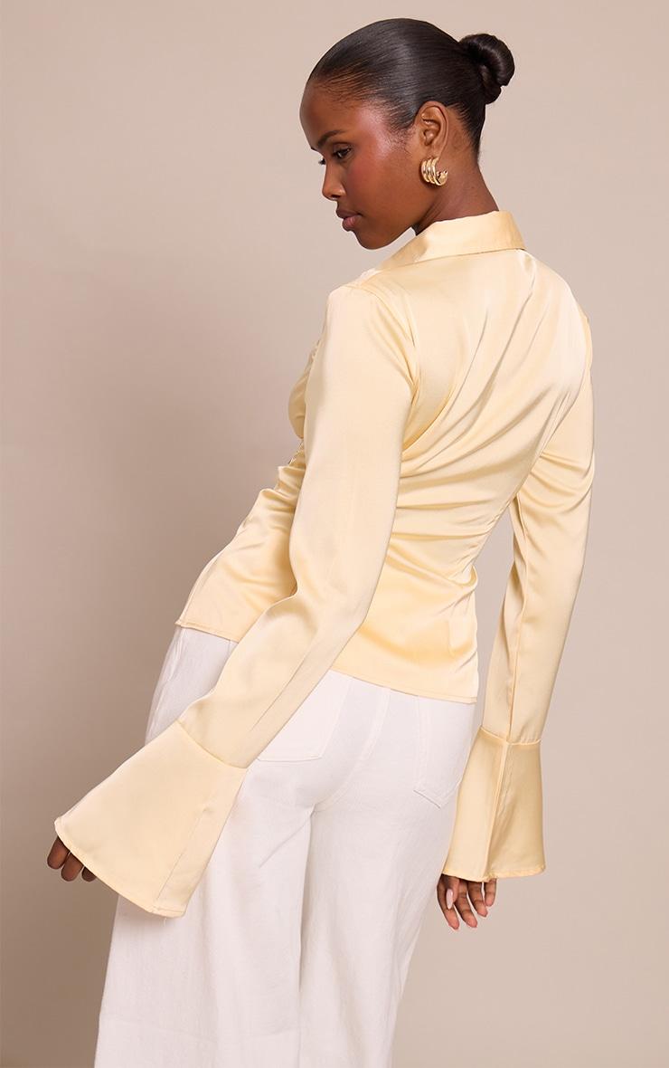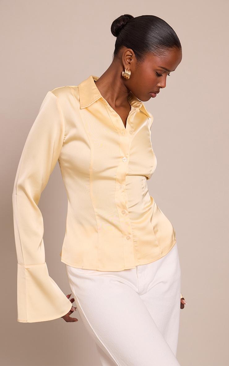 Exude elegance in the butter yellow satin flared sleeve fitted shirt. Made from a butter yellow satin material, it features flared sleeves, a fitted silhouette, and a button through front for a refined finish. Pair with slip on mule heels and gold earrings for timeless sophistication.Length approx 48.5cm/19inch (Based on sample size US 4)Model wears size UK 8/ EU 36/ AUS 8/ US 4Model Height - 5ft 9inchp]:!mb-4inch>Brand: PrettyLittleThingCategory: TopsProduct type: ShirtColor: Butter YellowMaterial: Tailored WovenDesign: PlainOccasion: Day