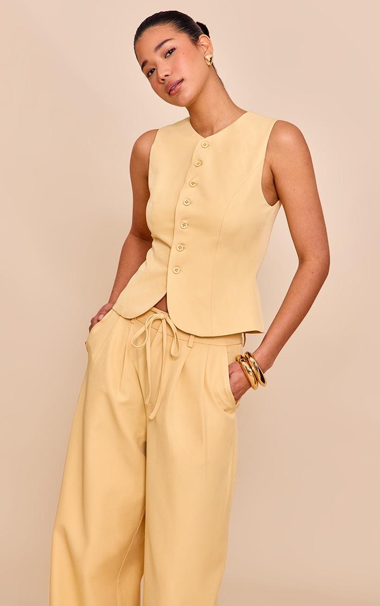Take your tailored look to the next level with this butter yellow tailored woven vest. Featuring a soft yellow material, this vest has a rounded neckline and classic button fastenings. Pair it with the matching pants, sandals and gold bangles for a sophisticated coordinated look.Length approx 48.5cm/19inch (Based on sample size US 4)Model wears size UK 8/ EU 36/ AUS 8/ US 4Model Height - 5ft 9inchp]:!mb-4inch>Brand: PrettyLittleThingCategory: Co-ordsProduct type: WaistcoatColor: Butter YellowMaterial: Tailored WovenNeckline: V NeckSleeves: SleevelessOccasion: Evening