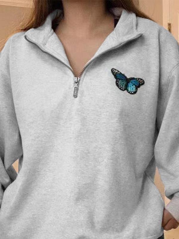 Butterfly Embroidery Embellished Half Zip Sweatshirt