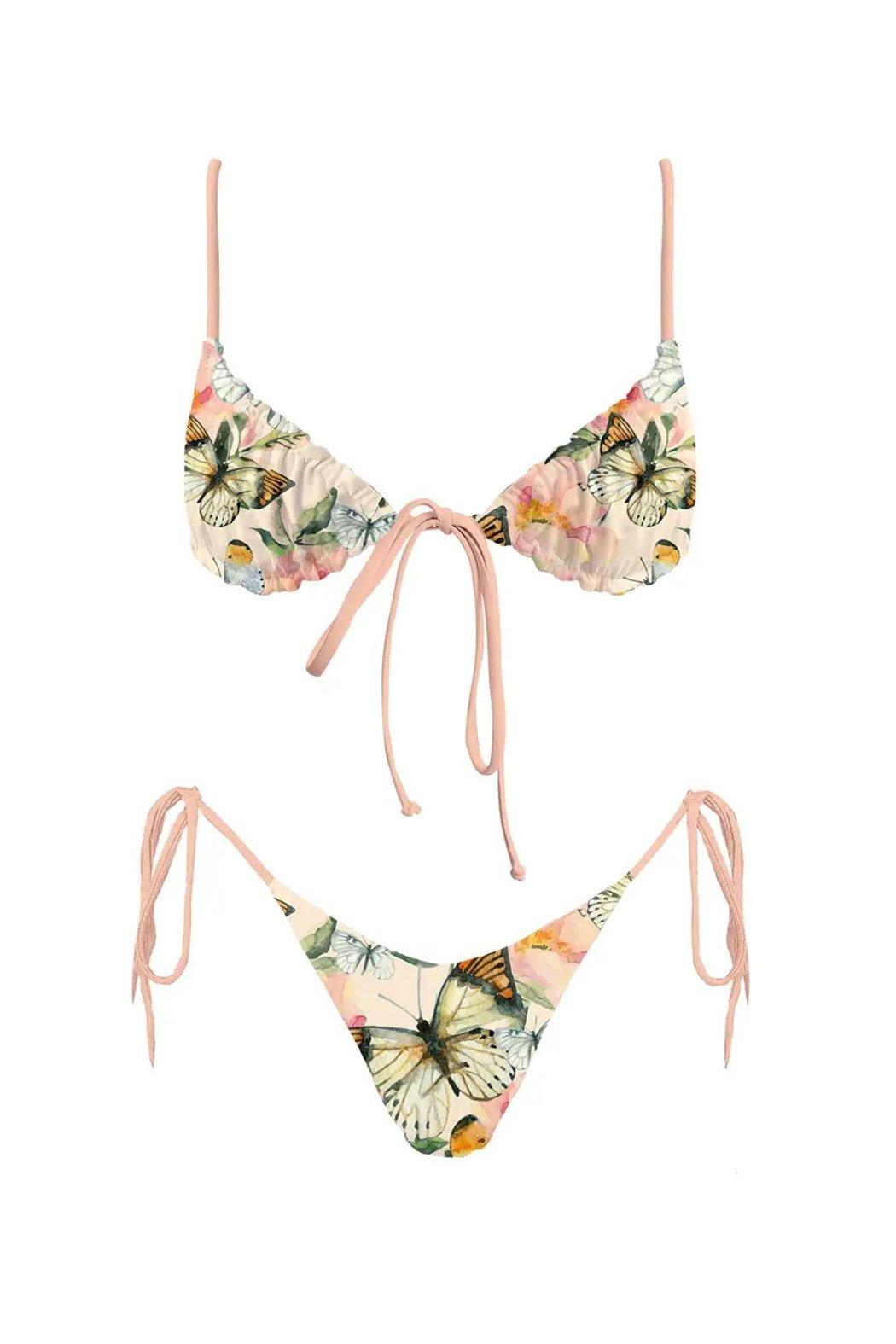This set features a delicate and vibrant butterfly print, the soft, pastel color palette complements the intricate butterfly designs, evoking a sense of lightness and joy. The adjustable tie closures and elasticized triangle top ensure a customizable fit, making it both fashionable and functional for a day by the water.