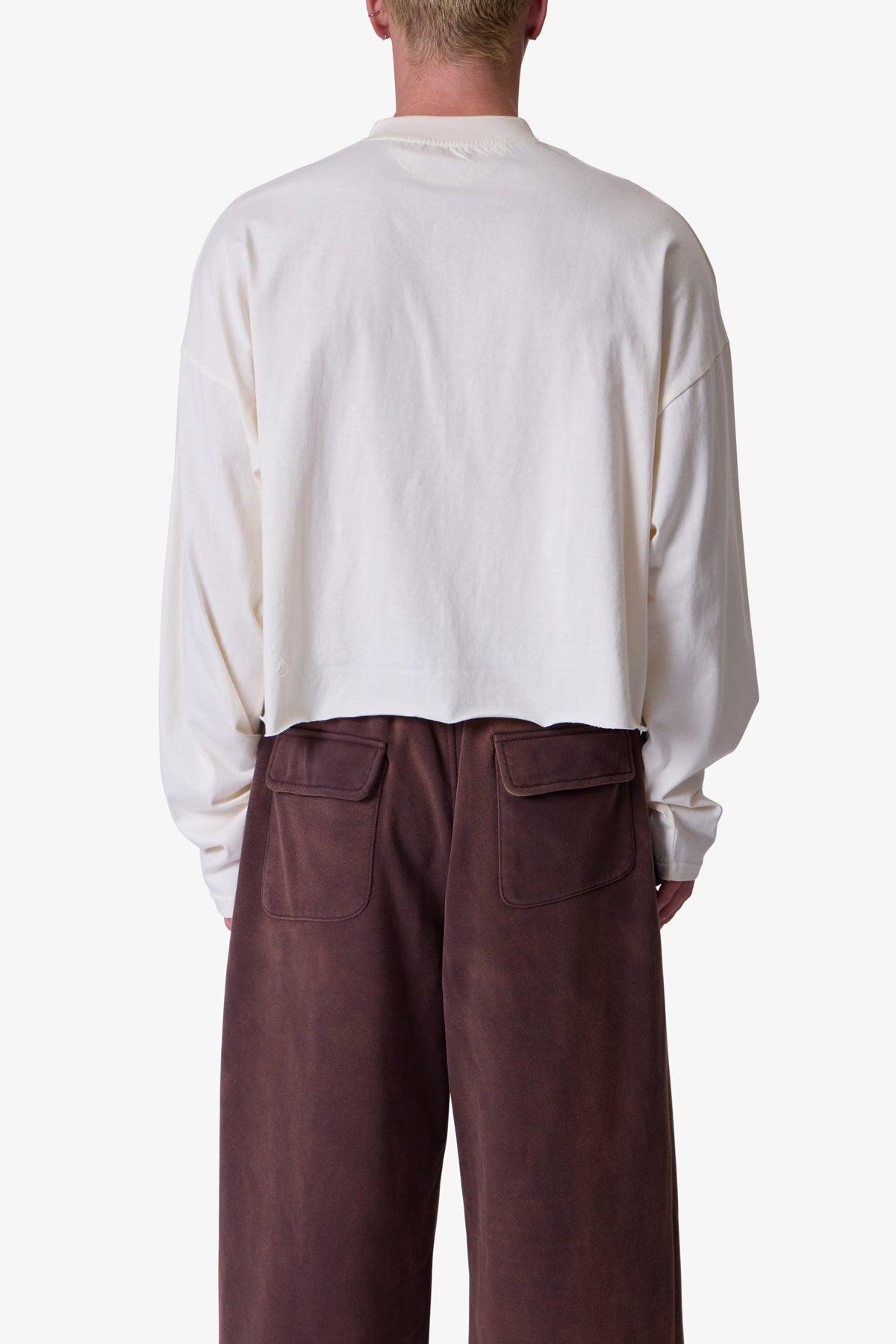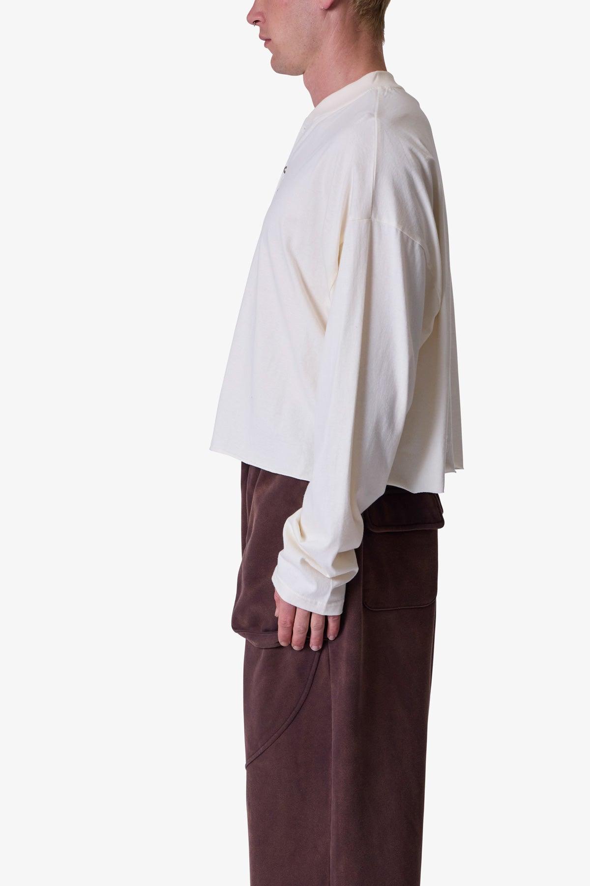the Button Fastened Oversized L/S Tee features a relaxed fit with a dropped shoulder design, standard hem detail at the wrists, raw edge at the bottom opening, a button placket at the neck, and is finished in a garment washed cotton fabric. details relaxed fit 100% cotton model is 6’1, 140 lbs and wears a size medium