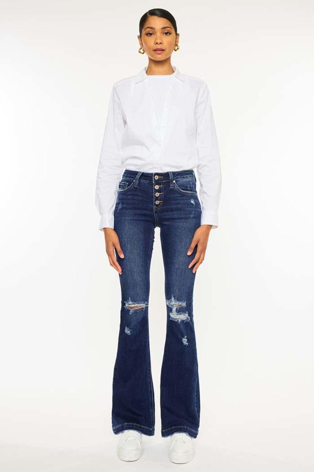 Button Up Distress Flare Jeans