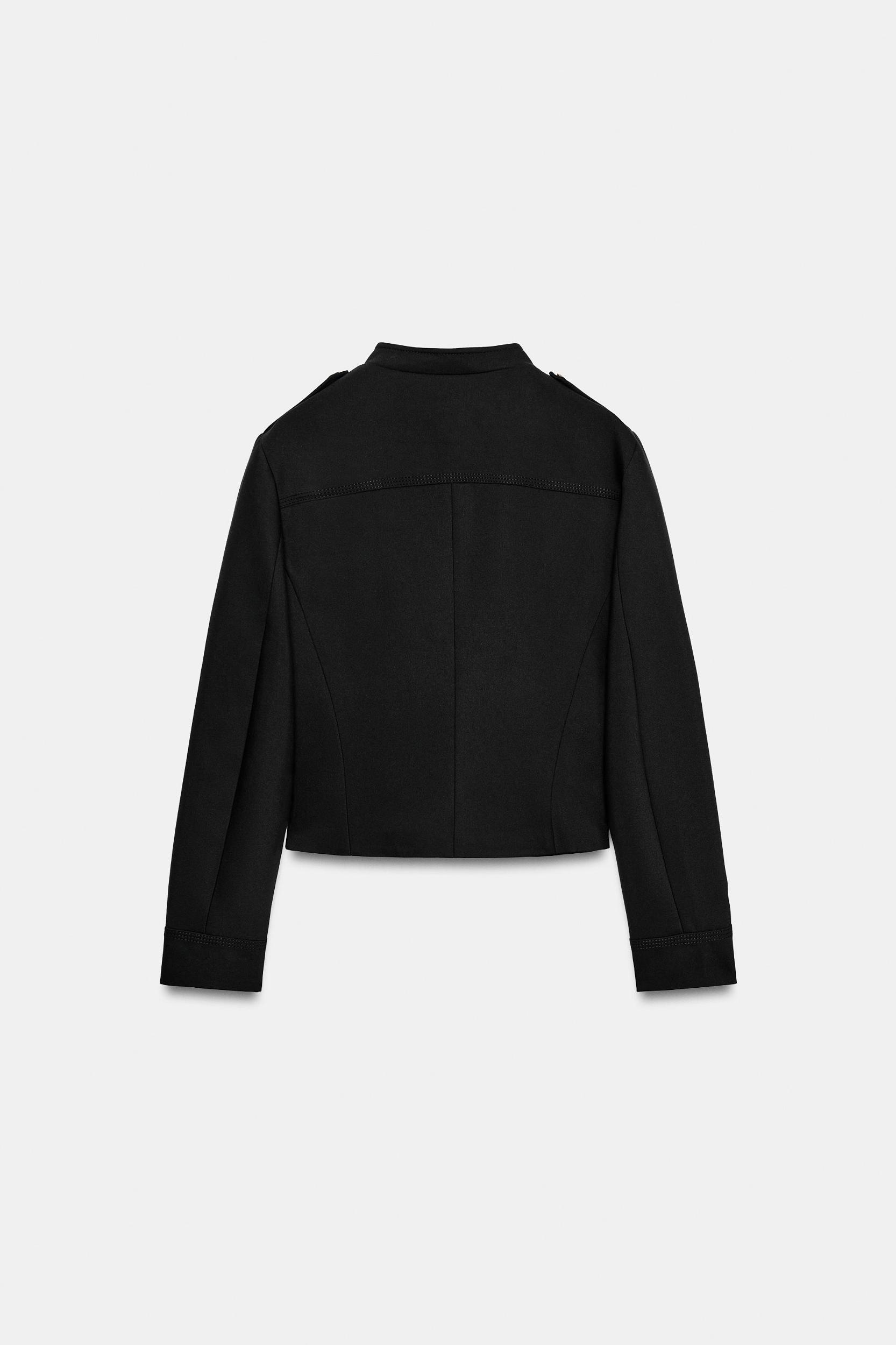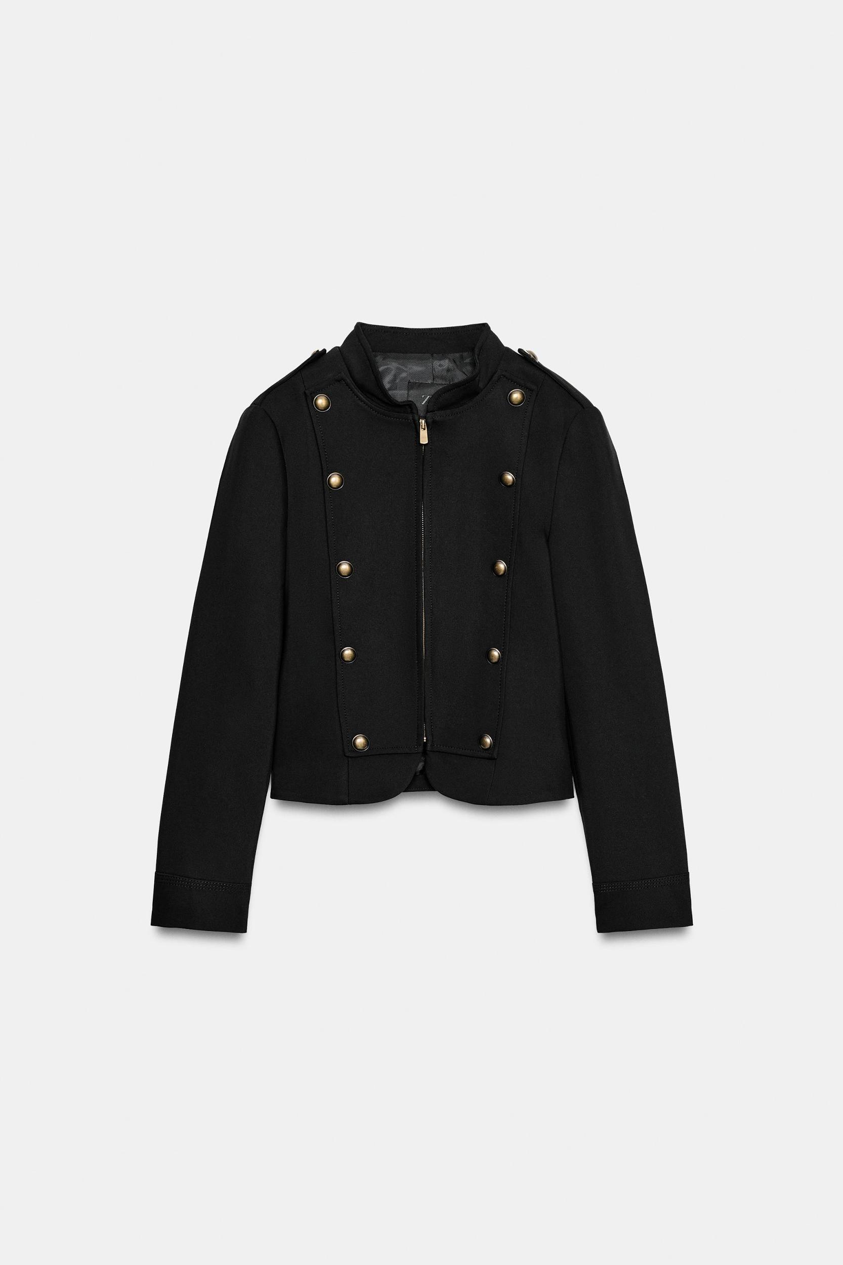 Long sleeve blazer with a round neck and tabs. Featuring contrasting buttons on the front. Tonal lining. Front zip closure.