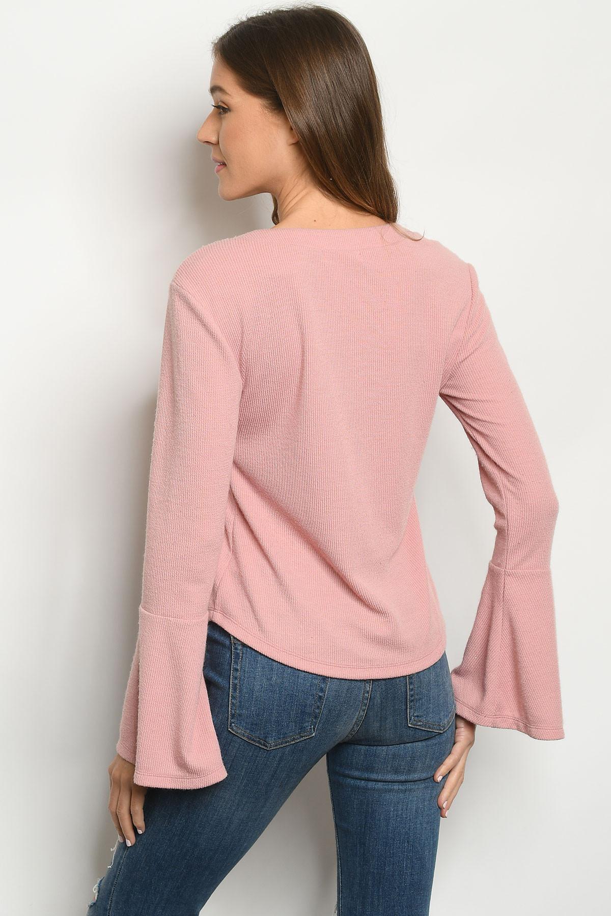 A beautiful long sleeves top to match any outfit! It features soft dusty pink color with front brown buttons detail, V-neckline, long flare sleeves with fitting shoulders style, material has stretch. Match it with dressy pants or skirt and put over a coat for a casual office style. It's a perfect piece for mid-season wardrobe. Model is 5'7" and wears size Small L: 23" B: 34" W: 34"