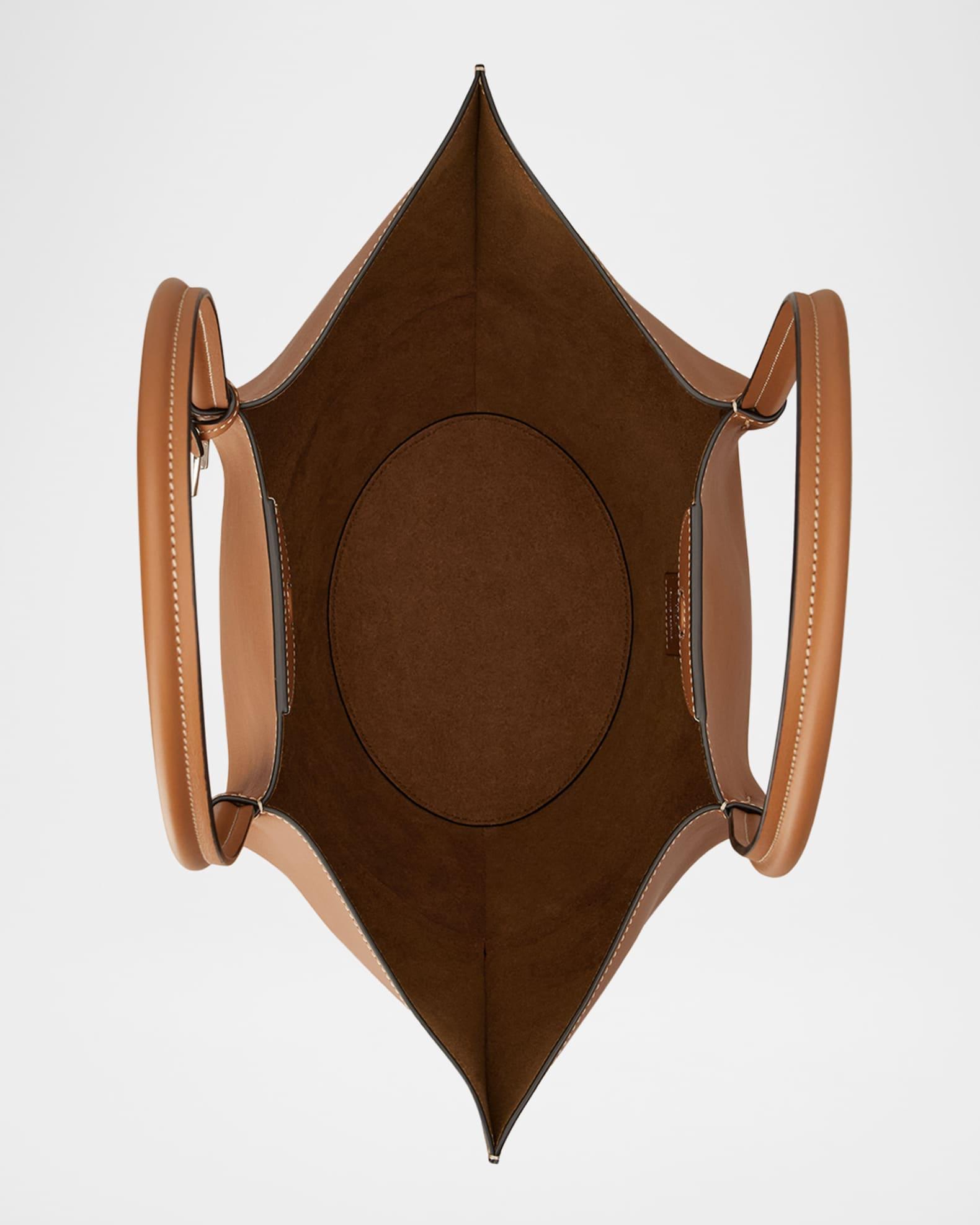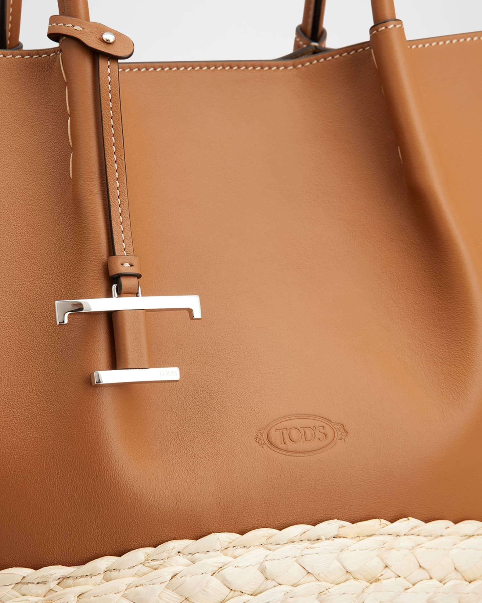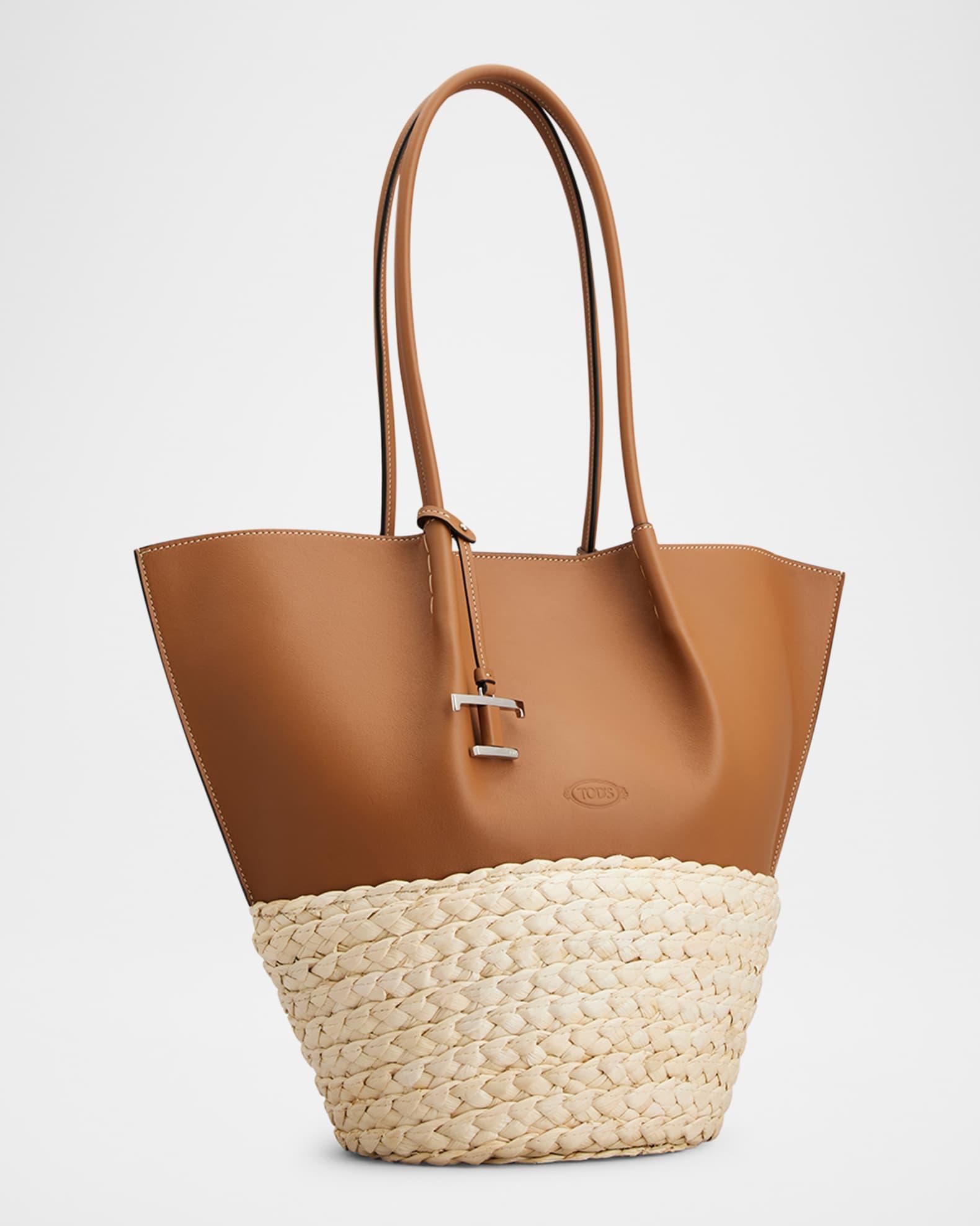 A combination of contemporary design and traditional craftsmanship, this medium shopping bag is crafted in calfskin napa leather, with a handwoven corn leaf base. Featuring long handles secured with distinctive stitching, it features Tod's logo stamped on the front and the T timeless pendant. Practical and lightweight, it is perfect in the city as well as on vacation thanks to its ambivalent mood. Tod's "Bux" shopping tote bag in leather and woven leaf Shoulder straps with removable T-charm, 10.6" drop Open top with magnetic closure Approx. 12.2"H x 16.9"W x 6.1"D Nylon/polyurethane Made in Italy