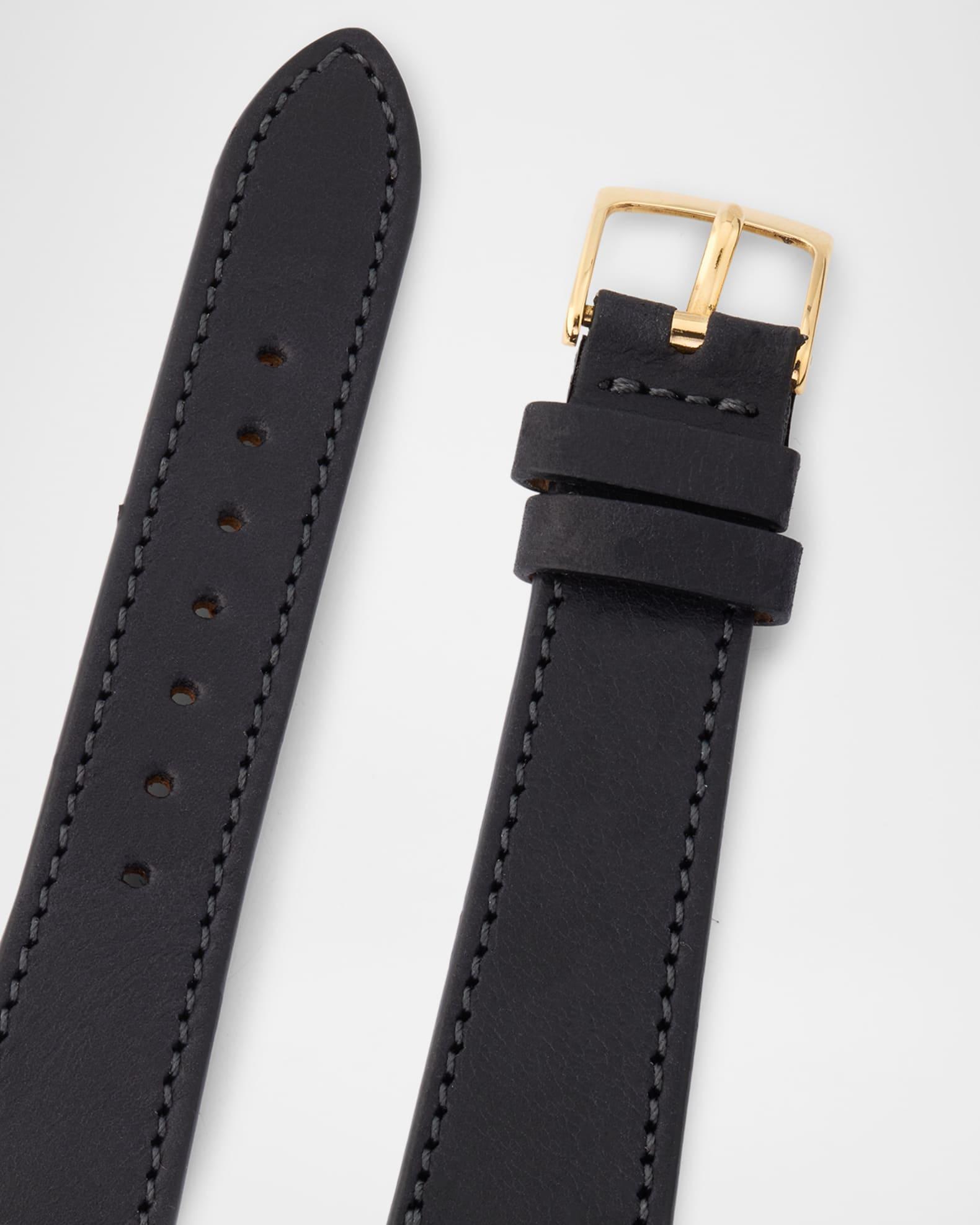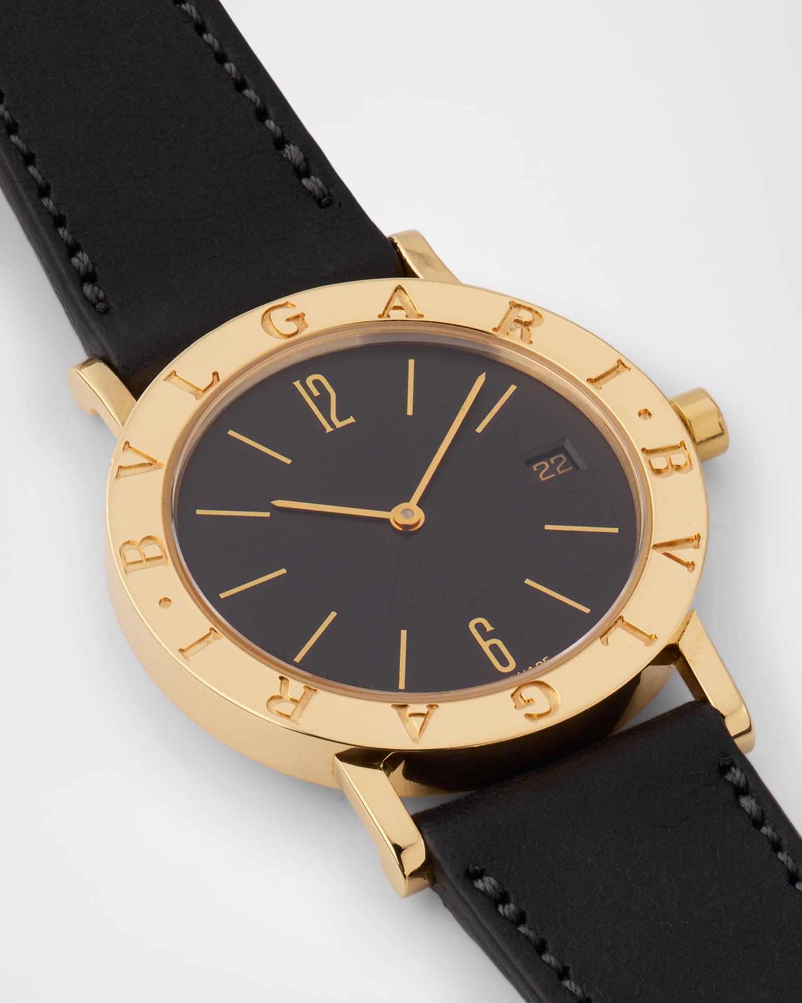 BVLGARI dress watch in 18-karat yellow gold Approx. 33mm round snap-back case The bezel is embossed with BVLGARI text Black dial with date window at 3 o'clock Arabic numerals and slash markers Two needle hands Brown leather strap 18-karat yellow gold tang buckle Sapphire crystal window Quartz movement Reference # BB 33 GL Caliber # 732-MBBE 8-Jewel Circa 1990s Each Vintage Watch purchase includes a Neiman Marcus watch box and a Neiman Marcus certificate of authenticity. Original boxes and papers are not offered in most instances and will be noted on the site when they are included. Made in Switzerland Please Note: All watches have a one-year warranty on parts and labor, excluding stem and crystal. A watch that has been dropped, abused, or overwound is not covered under the warrant. This watch is FINAL SALE.
