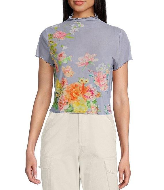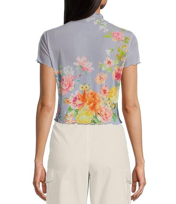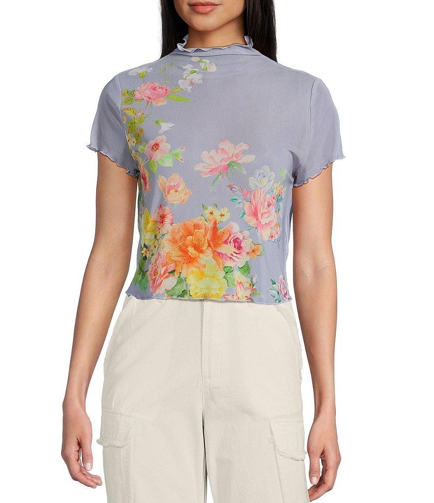 From C&V Chelsea & Violet, this top features: Mesh Floral print Ruffle mock neck Short sleeves Pullover styling Polyester/spandex Machine wash/line dry Imported.