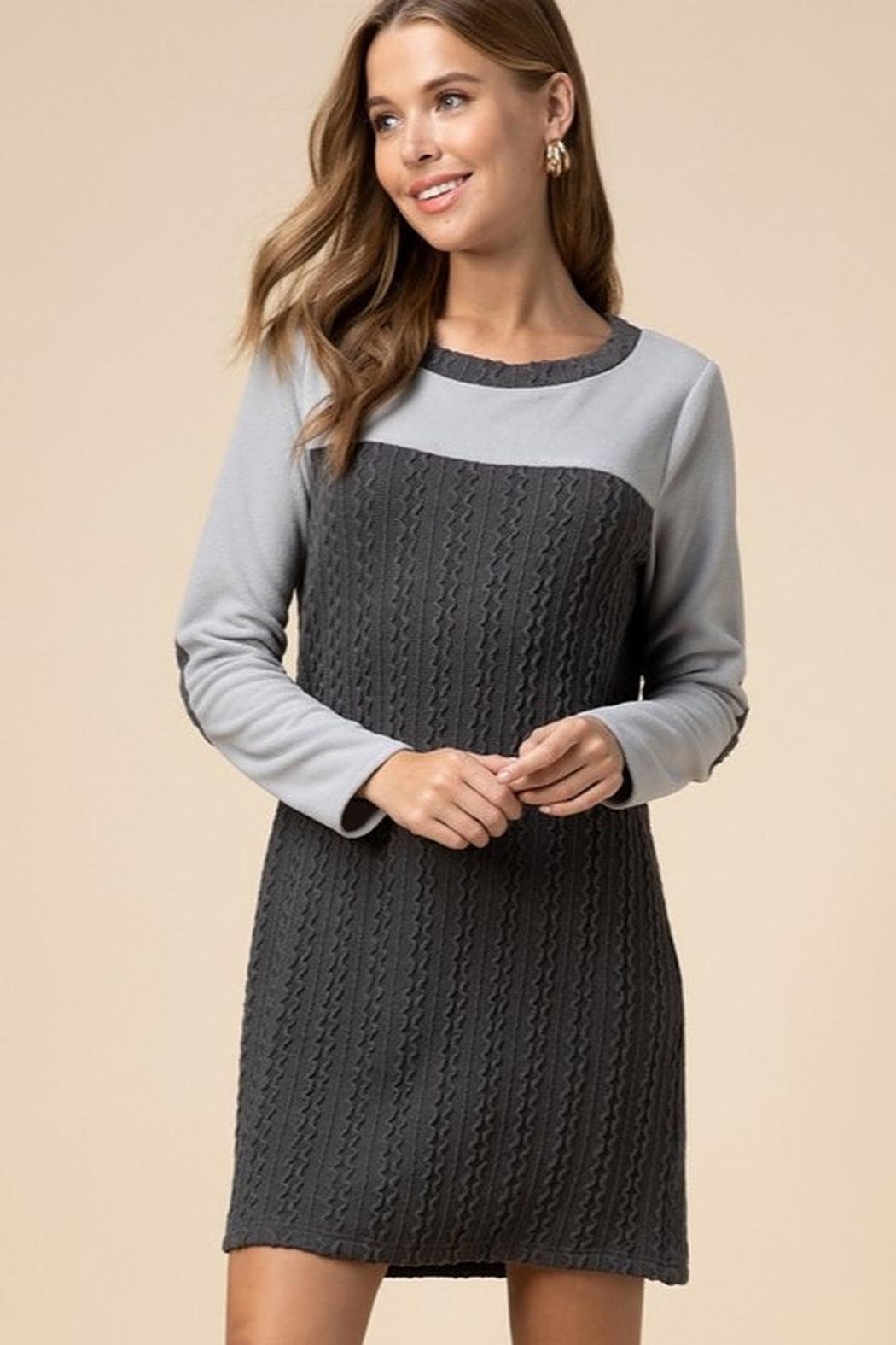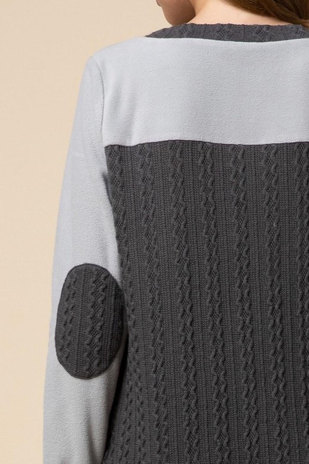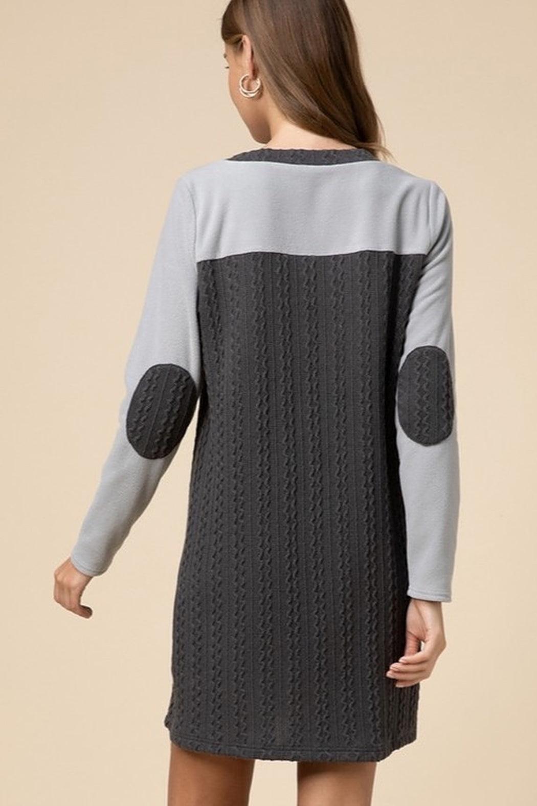 Fleece cable-knit sweater dress featuring elbow patch detail. Unlined. Non-sheer. Knit. Lightweight