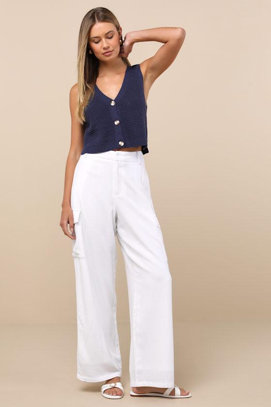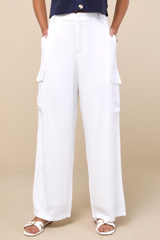 The breezy, linen-blend construction of the trouser pants makes them the perfect companion for your next tropical vacation. The high-rise silhouette features belt loops and wide, full-length pant legs with diagonal front pockets and cargo-inspired side pockets. Top clasp closure and hidden zip fly.