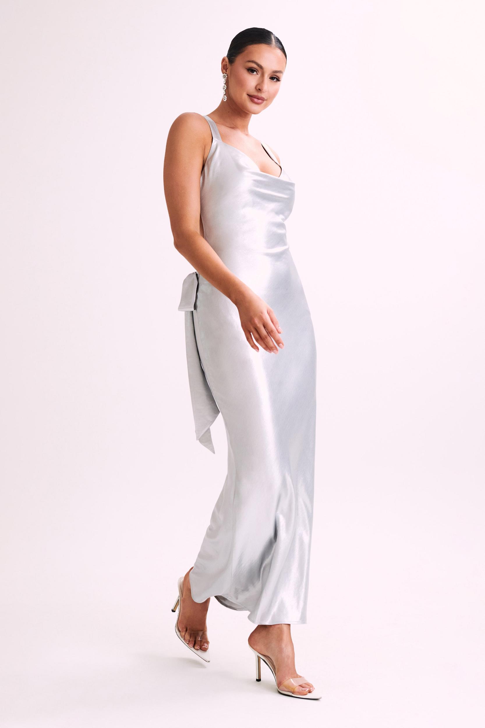 The art of asymmetry.The CAELLIE is a sleeveless maxi dress with a draped cowl neckline at the front and a low, asymmetrical neckline at the back. Modestly thick shoulder straps blend into a fetching criss-crossed pattern at the upper back, perfectly accentuating the back neckline’s subtle tilt. A functional side tie at the waist adds visual texture to the flattering, curve-hugging silhouette. The fabric is soft and fully-lined, promising comfort for all-day wear.