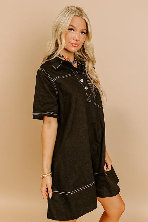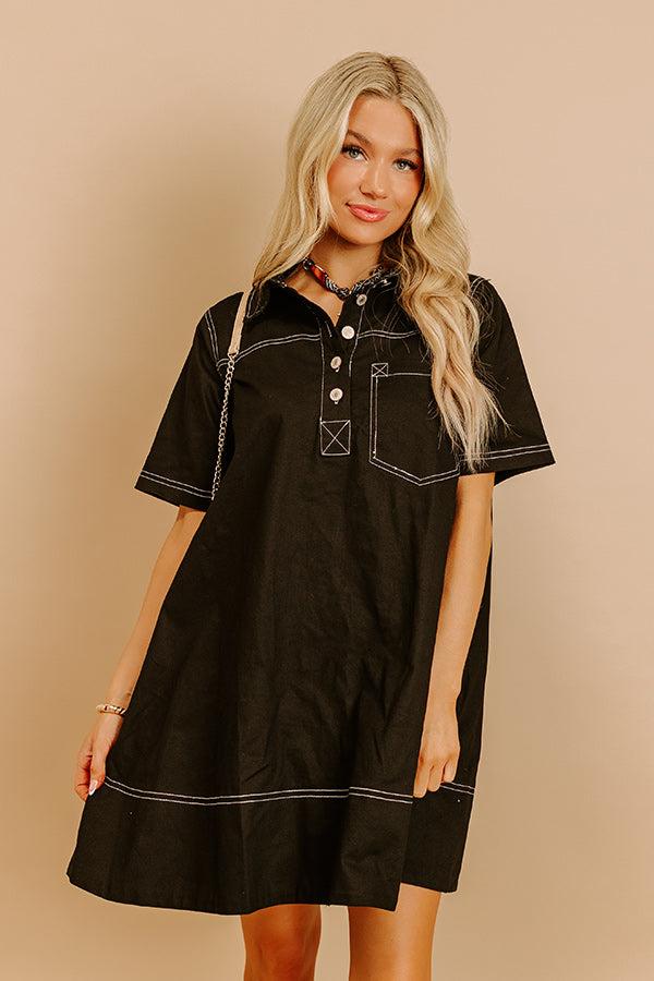 - From the cafe to downtown strolls, this cute denim mini dress makes a chic impression! With its laid-back charm and trendy accent stitching, this darling dress is a magnet for compliments.