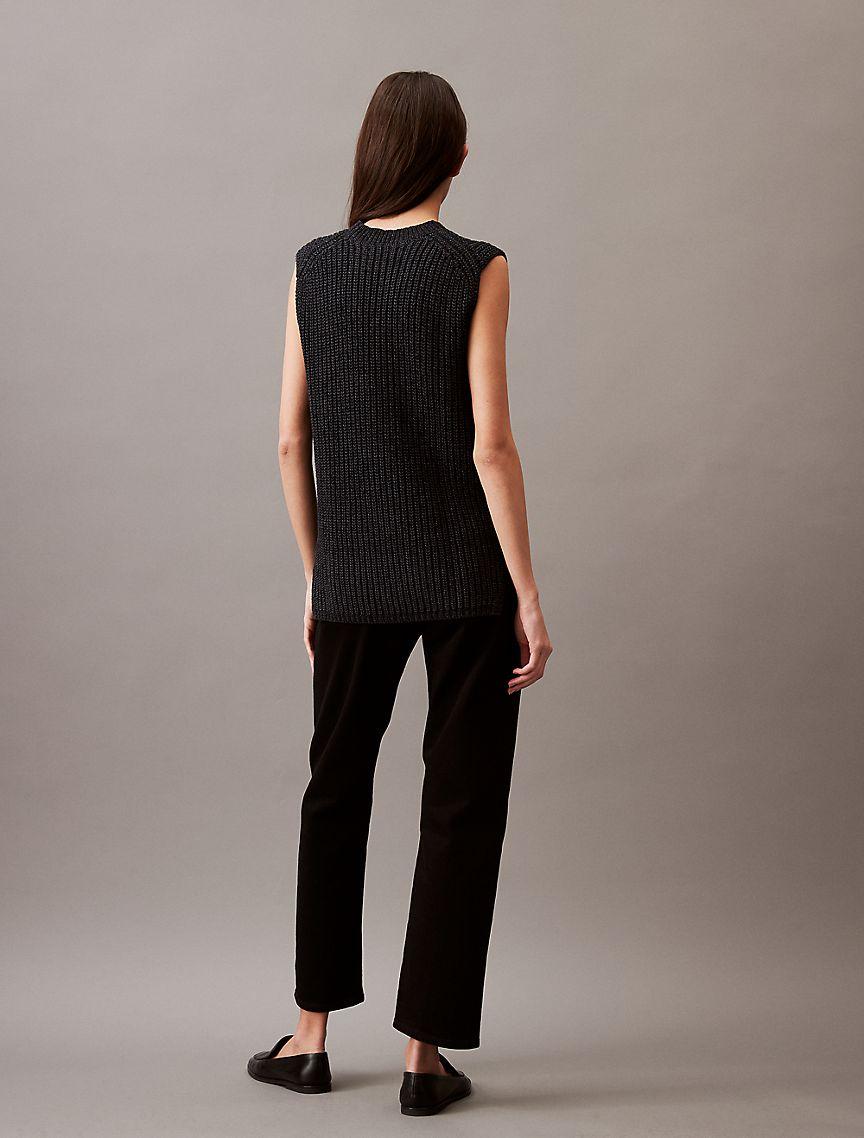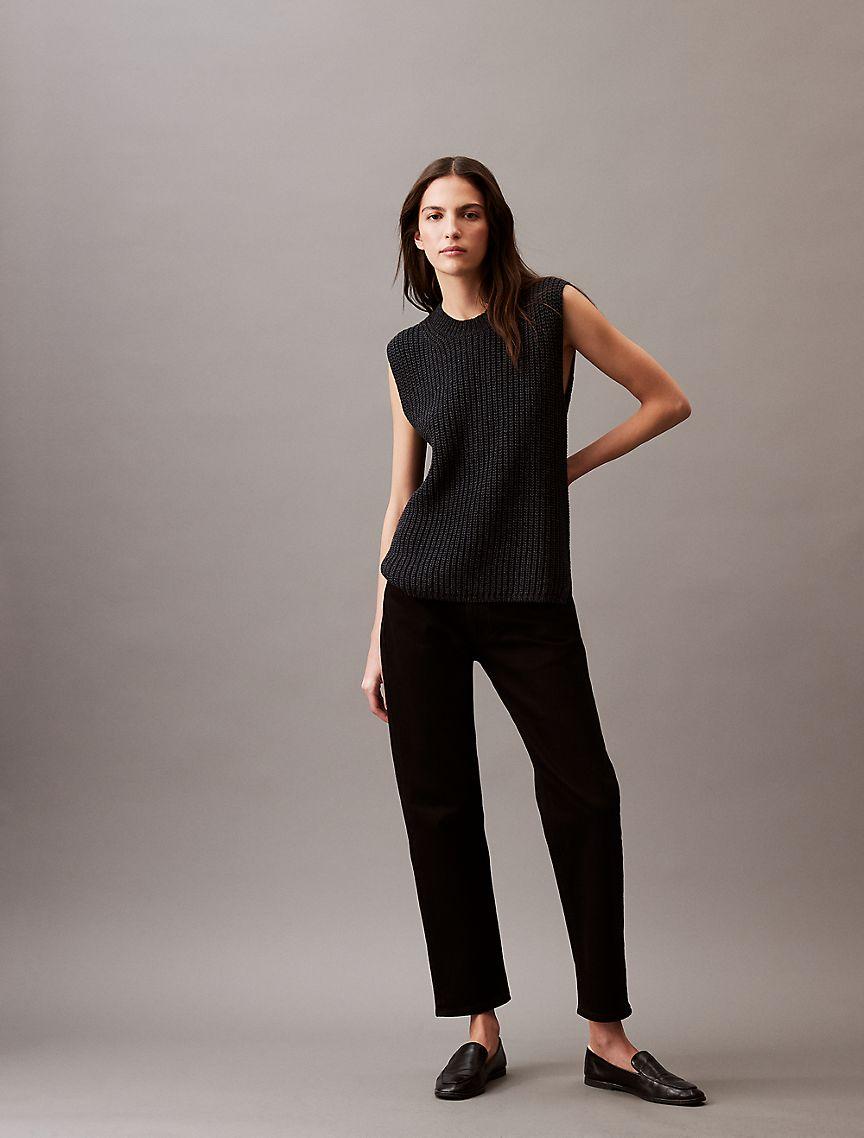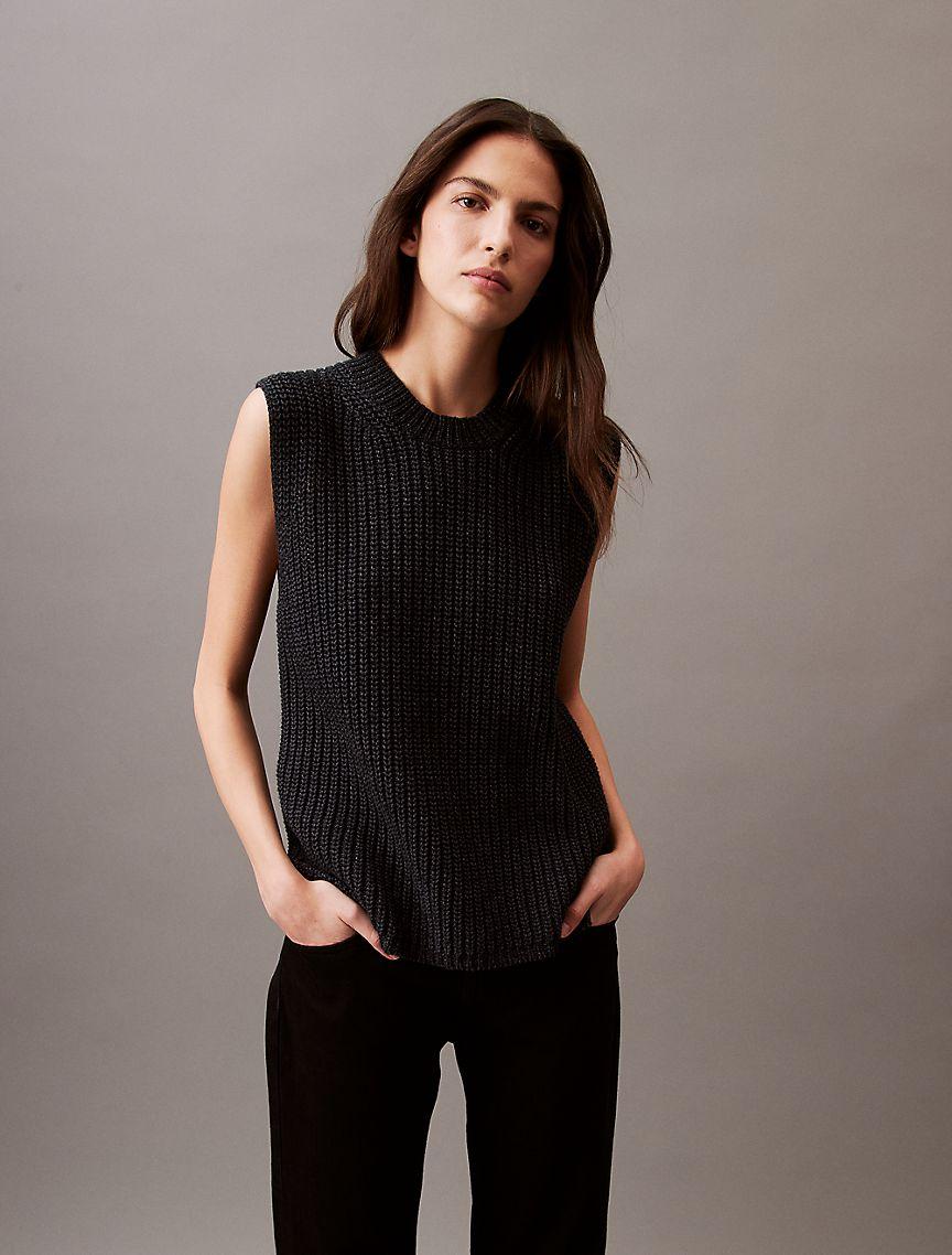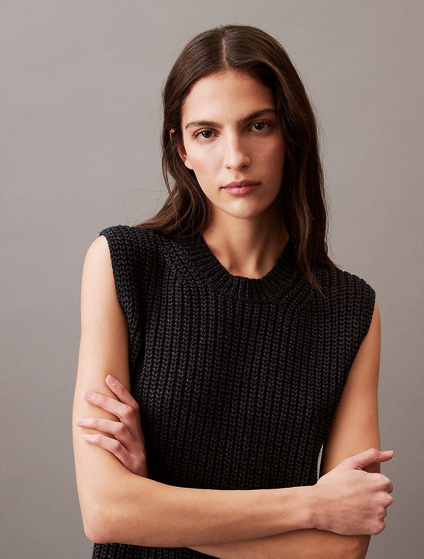 A chunky pullover vest, crafted from a soft cotton acrylic blend in a cage yarn knit. Designed with relaxed fit shaping and ribbed texture at the crewneck. Detailed with a split hem at both sides.