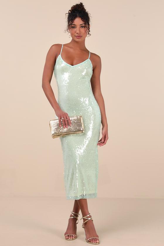 Dazzle your way through anything with the Lulus Cahya Mint Green Sequin Tie-Back Midi Dress! Sheer, airy woven fabric (atop a matching lining) boasts sparkling clear sequins as it shapes a flattering V-neckline and a darted bodice, supported by adjustable spaghetti straps. High, fitted waist sits atop a column midi skirt with a kick pleat at back for movement. A cute tie-back detail crosses the otherwise open back design. Hidden back zipper/clasp.
