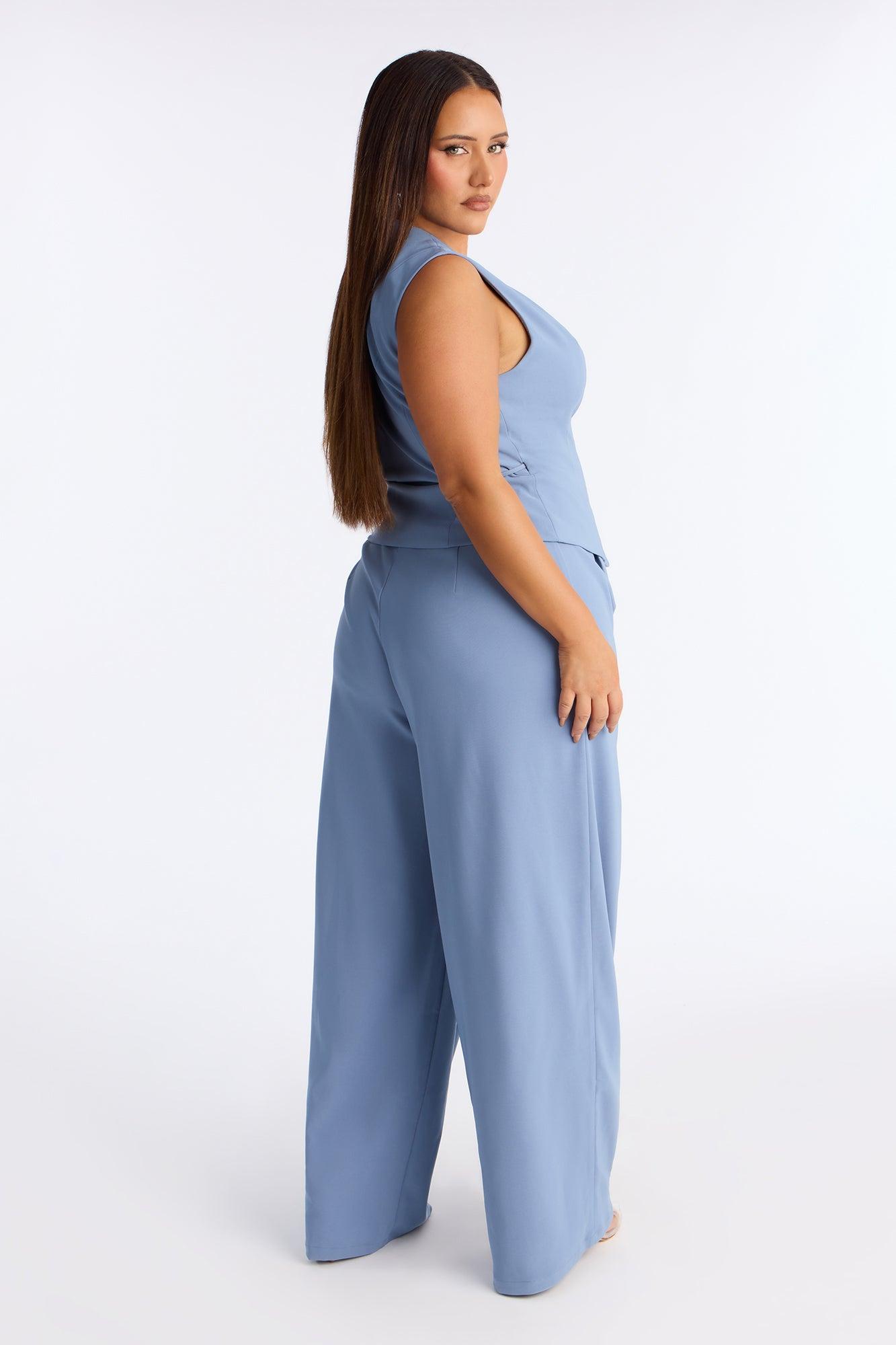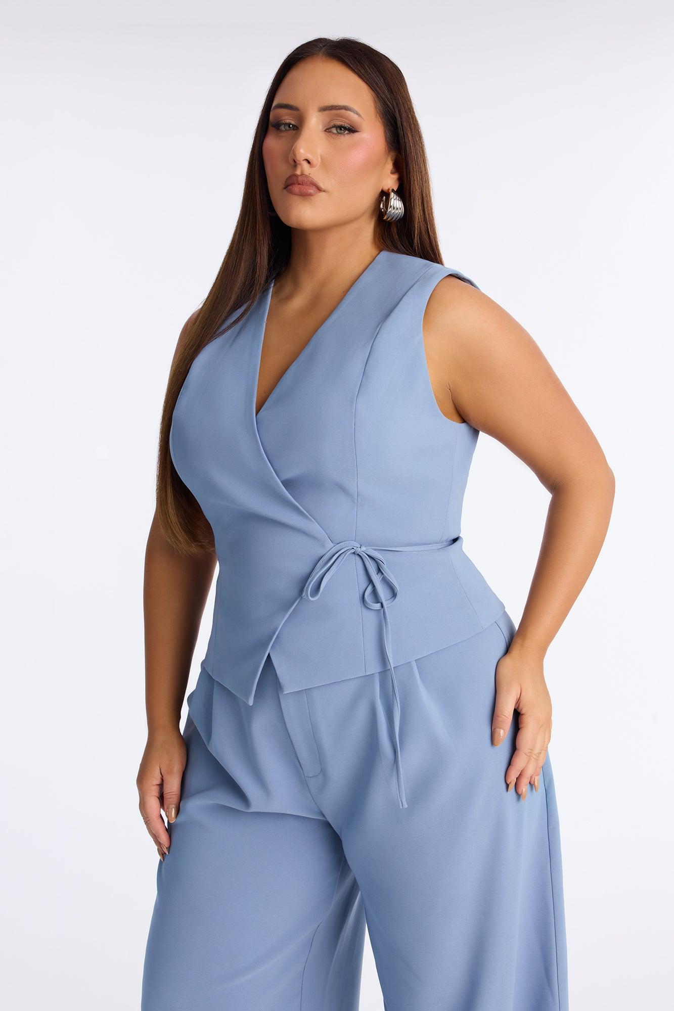 Available In Blue. Jumpsuit Moderate Stretch Sleeveless Tie Front Top Closure Wide Leg Front Clasp And Zipper Closure 32.5" Inseam Self: 92% Polyester 8% Spandex Lining: 100% Polyester Imported