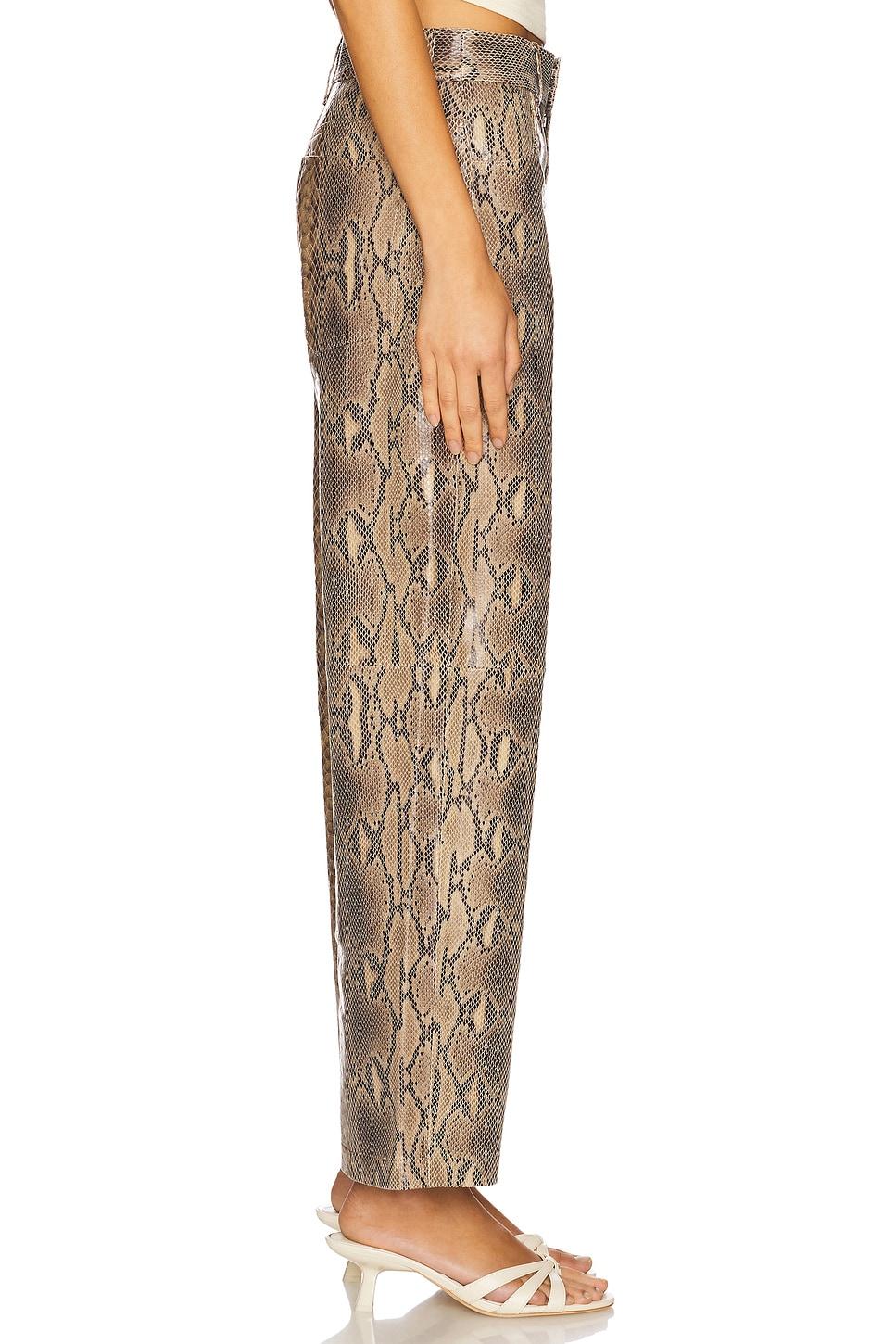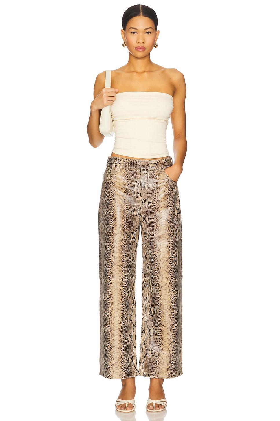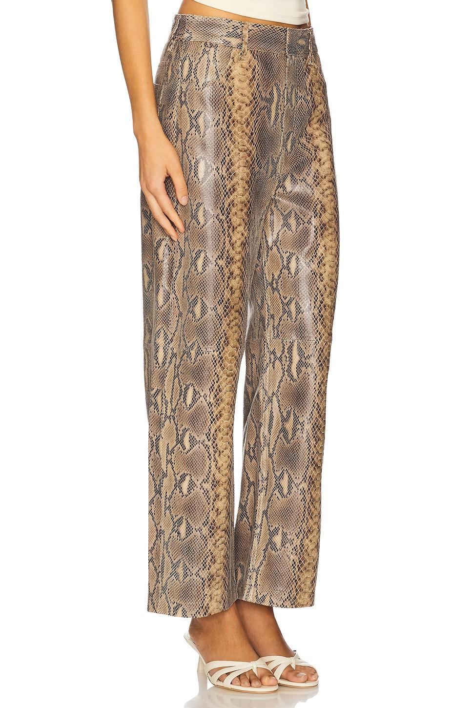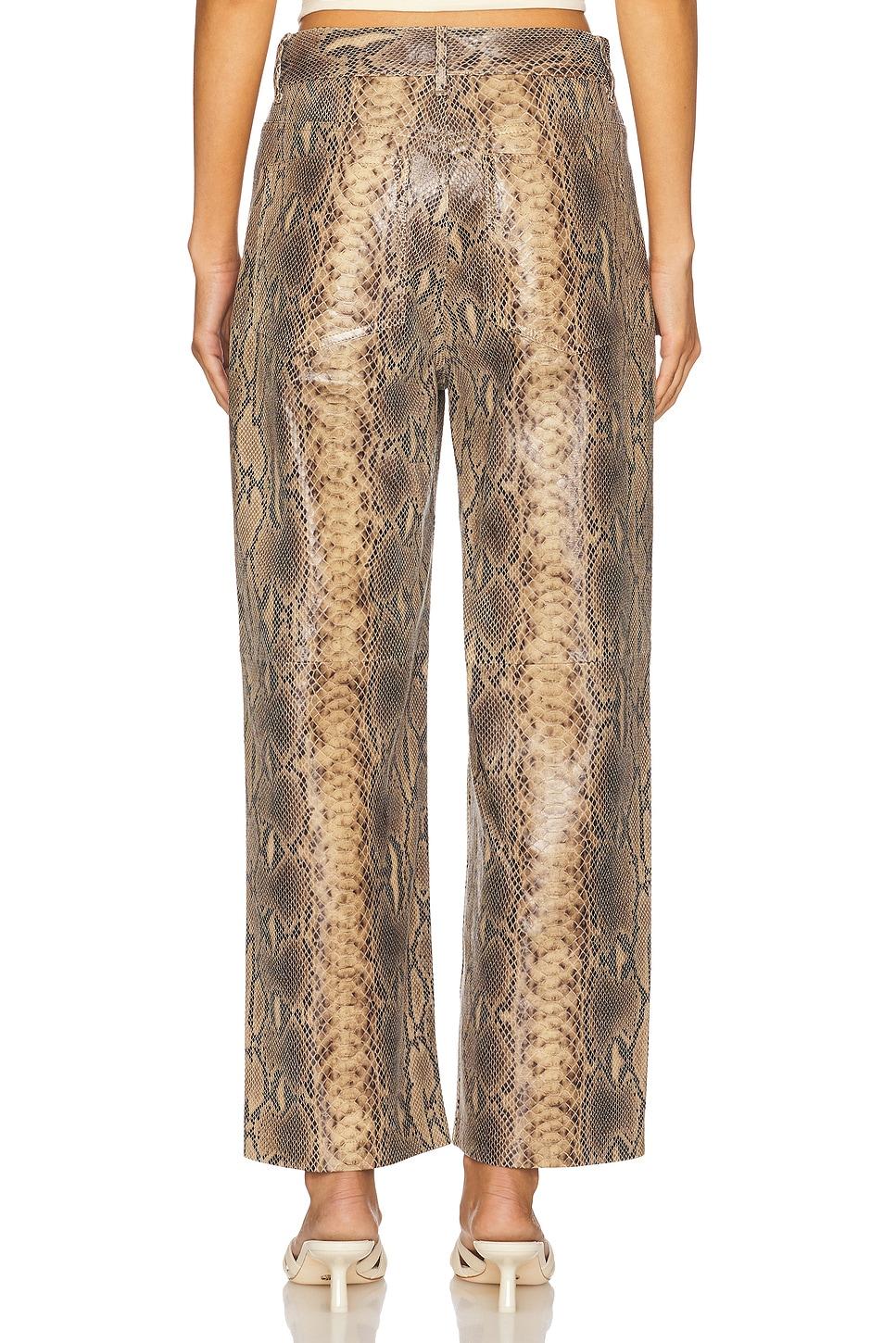 100% cow leather. Professional leather clean only. Zip fly and button closure. 4-pocket styling. Snake embossed leather. 21" at the knee narrows to 18" at the leg opening. Made in Turkey. Revolve Style No. BYMA-WP16. Manufacturer Style No. 103221.