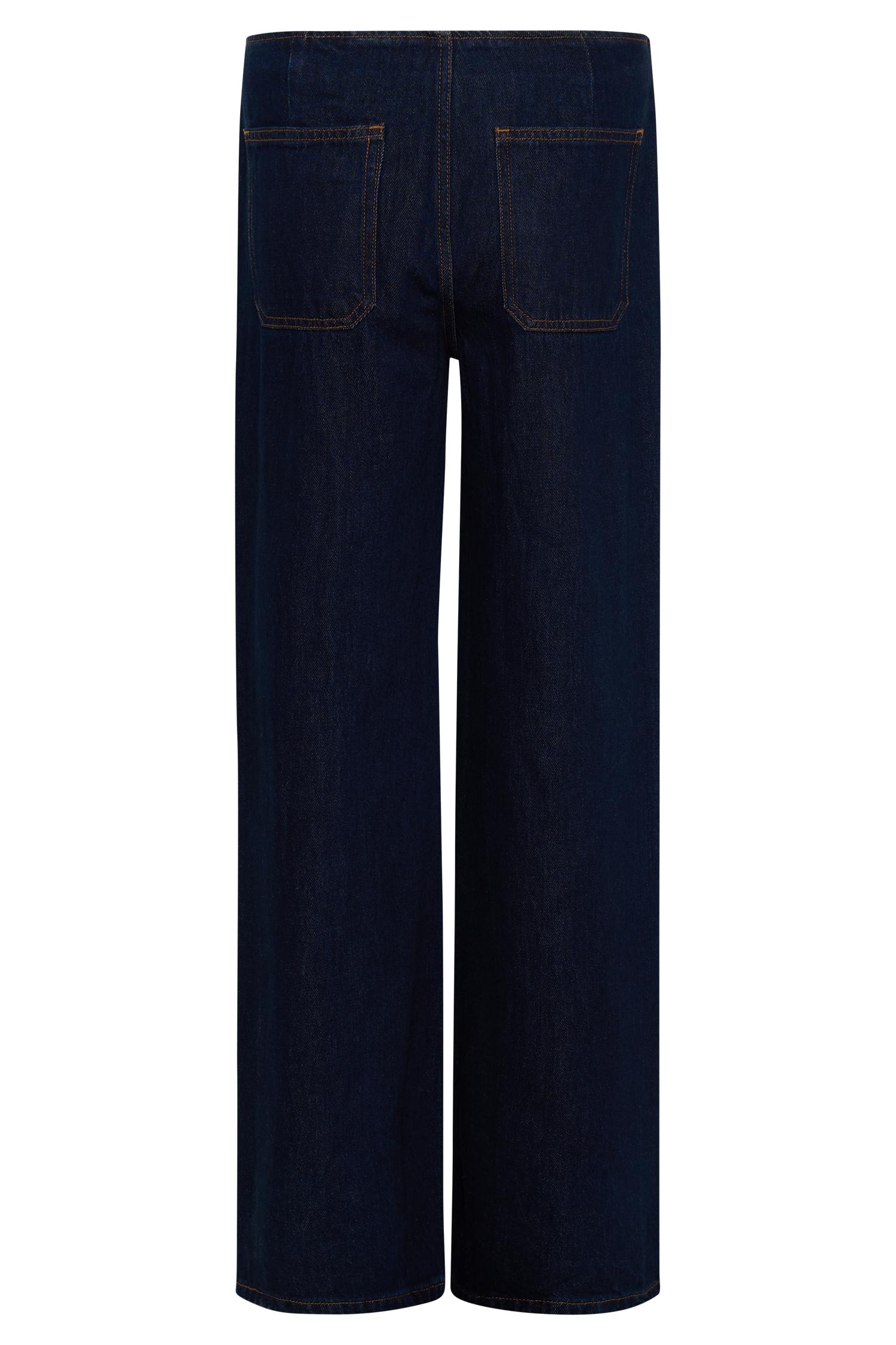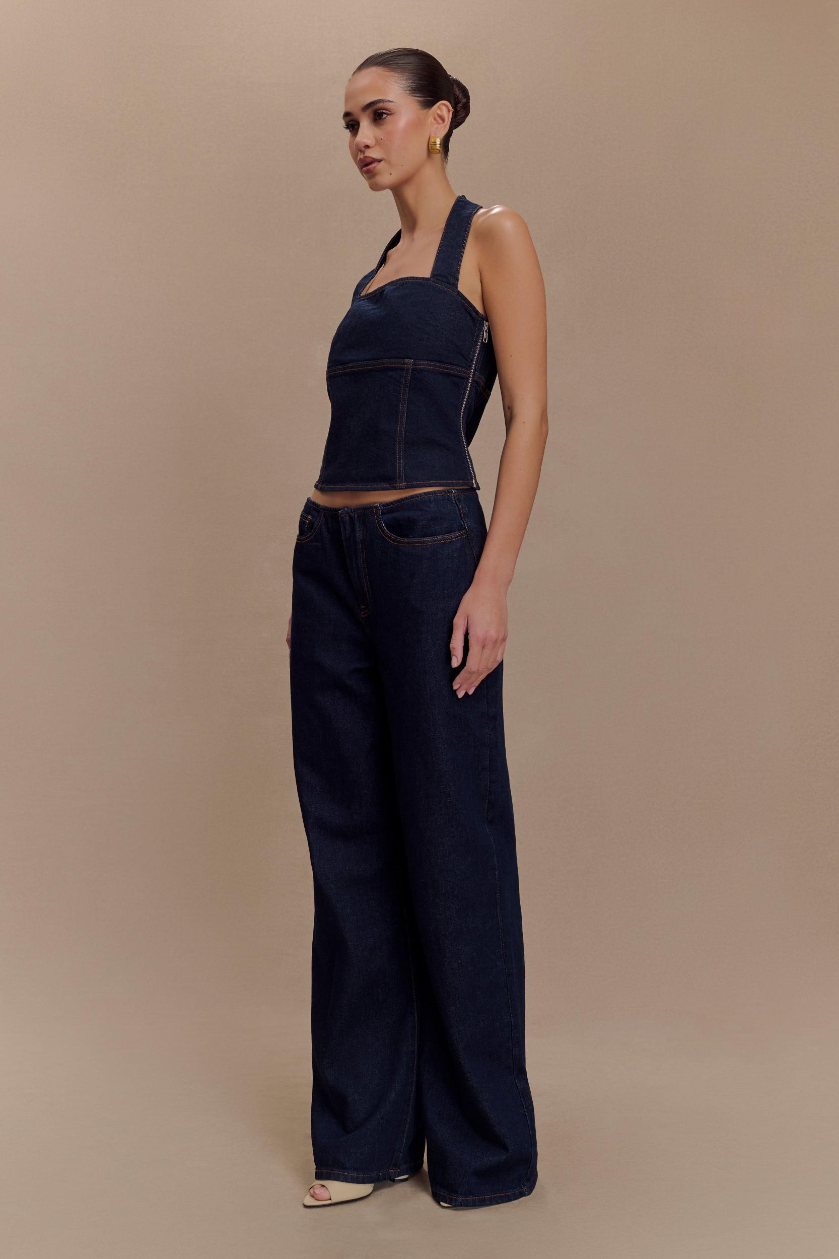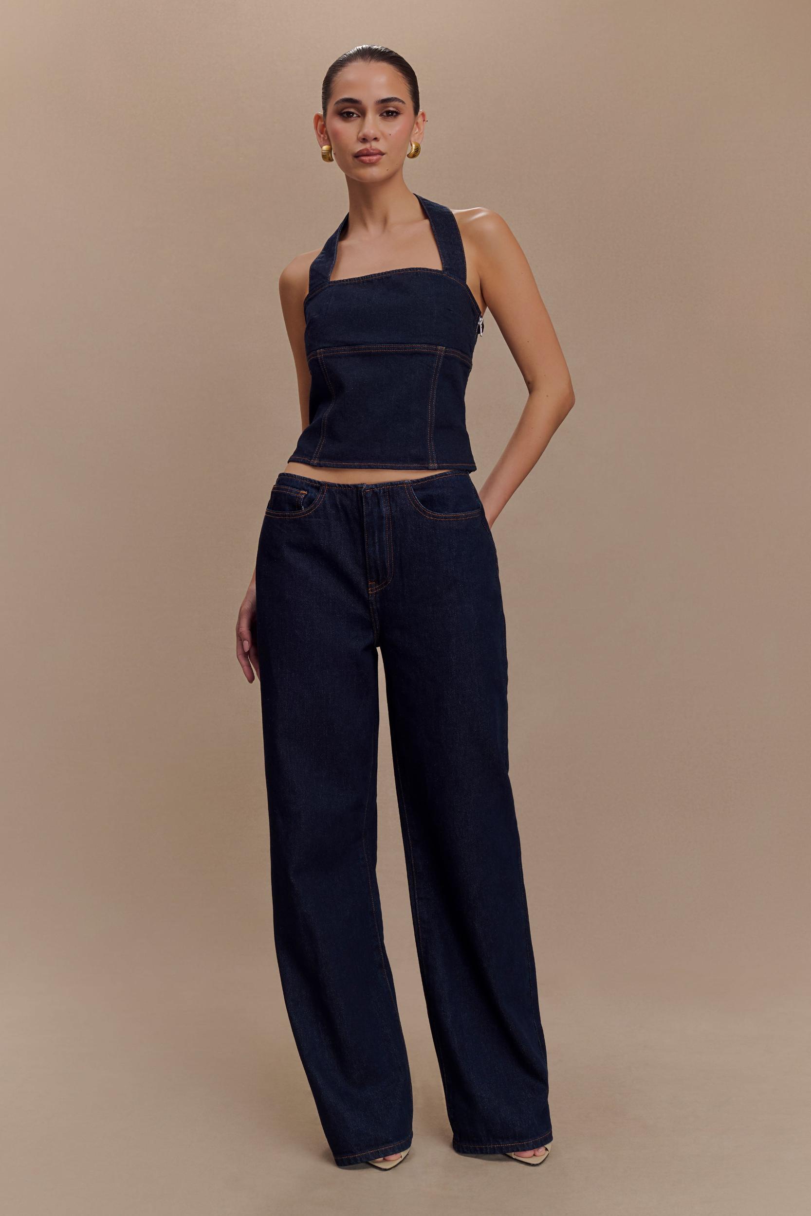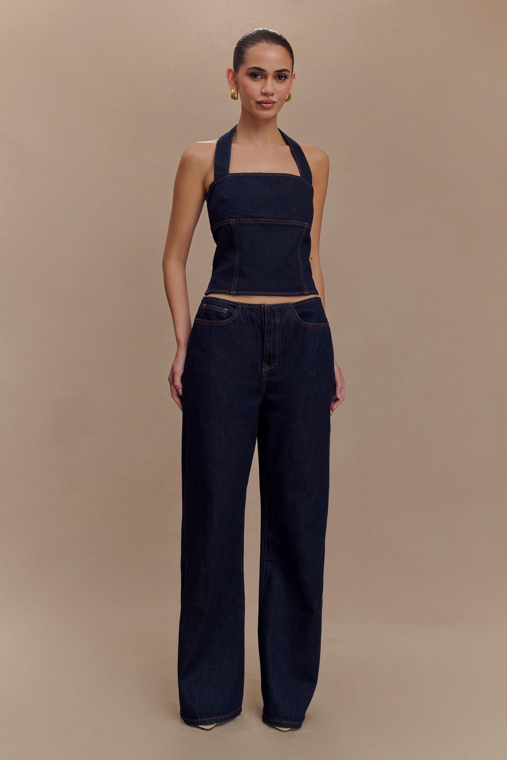 Flared for your style. The CAITLIN Mid Rise Denim Flare Jeans offer a modern take on classic denim, designed for both style and comfort. With a flattering mid-rise waist and a sleek, straight-leg fit, these jeans elongate the legs while maintaining a relaxed silhouette. The fly front closure ensures a secure fit, while the front and back pockets add both functionality and detail. Finished with a waistband-less design for a smooth, contemporary feel, these jeans are perfect for elevating your everyday casual look. Pair with the Dayna Denim Halter Top for a complete, effortlessly chic ensemble.
