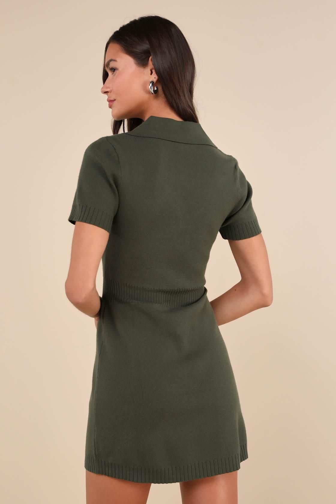 You can anticipate plenty of compliments when you style a cute pair of sneakers with the Lulus Calculated Charm Olive Green Short Sleeve Mini Sweater Dress! Soft, medium-weight sweater knit shapes this chic dress that features a classic collared neckline and fitted bodice with a partial, Henley-inspired button placket at the center, framed by short sleeves. The banded waist and figure-skimming, A-line mini skirt will effortlessly flaunt your silhouette all day long. Contrasting ribbed knit accents the cuffs, waist, and hem.