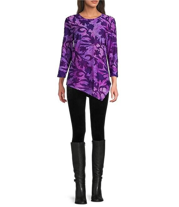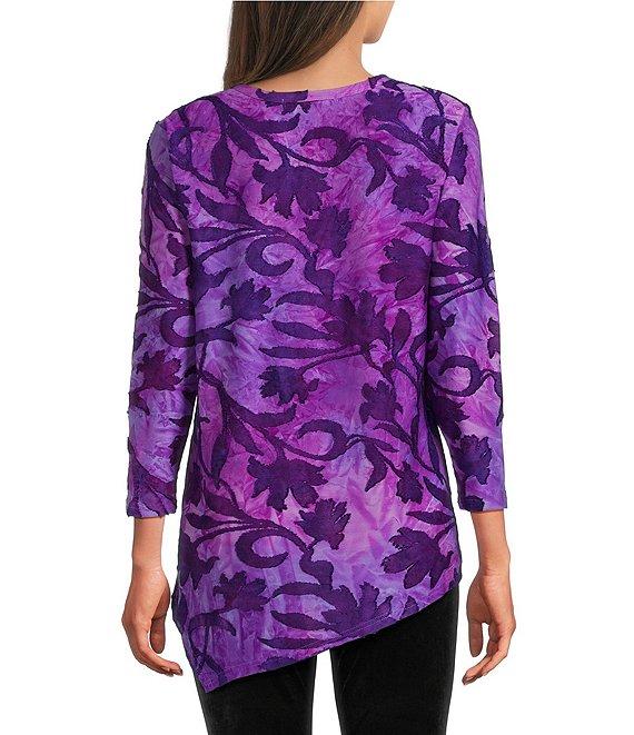 Calessa Burnout Tie-Dye Knit Crew Neck 3/4 Sleeve Asymmetric Dipped Hem Tunic