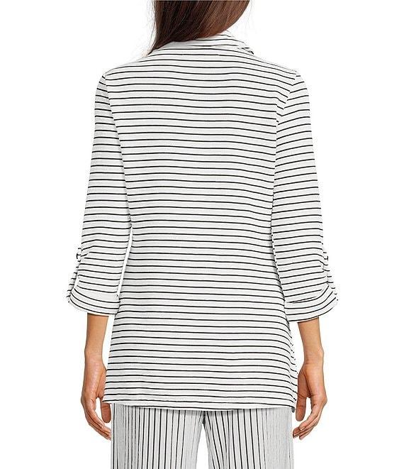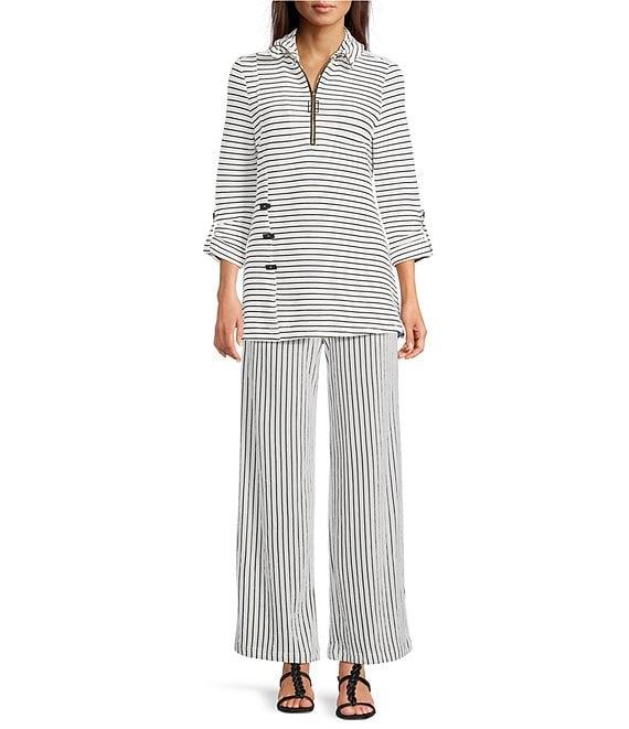 From Calessa, this tunic features: Textured yarn-dye knit fabrication Wire collar 3/4 roll-tab sleeves Comfort fit Button accent details Pullover construction Straight hem with side vents Quarter zip closure Approx. 29" length Polyester/spandex Machine wash/hang dry Imported.