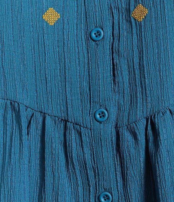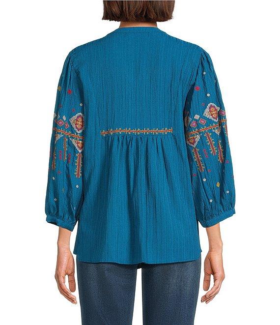 Calessa Crinkle Textured Ikat Embroidered Split V-Neck Wrist Sleeve Button-Front Tunic