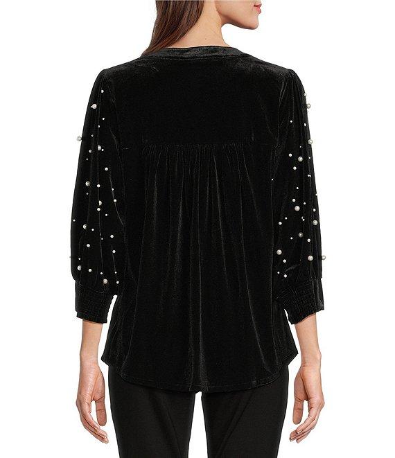 From Calessa Petite, this tunic features: Velvet fabrication Split v-neckline 3/4 sleeves Comfort fit Embroidered motif Faux pearl beaded detail at sleeves Straight hemline Button-front closure Approx. 26" length Polyester/spandex Hand wash cold/line dry Imported.