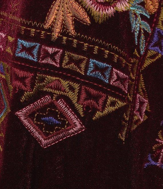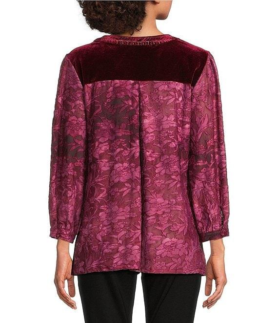 From Calessa Petite, this tunic features: Velvet & knit burnout fabrication Split v-neckline Bracelet length floral burnout knit sleeves with button cuffs Comfort fit Embroidered floral front panel Floral burnout knit back with velvet yoke Pullover construction Approx. 28" length Polyester/spandex Hand wash/ line dry Imported.
