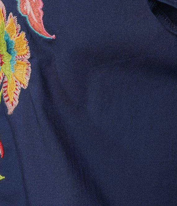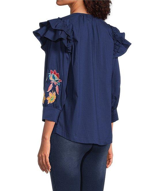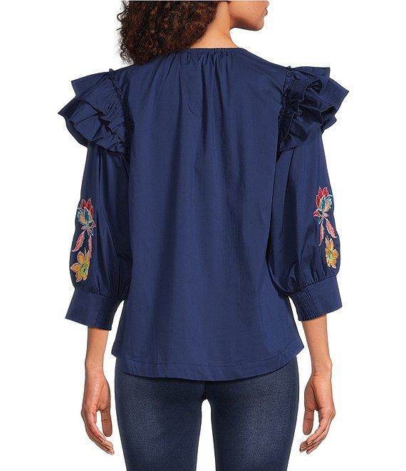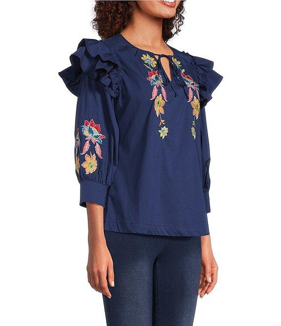 From Calessa Petite, this top features: Woven fabrication Split v-neckline with ties Elbow length sleeves Ruffle detail Embroidered floral motif Straight hem Pullover construction Approx. 25.5" length Polyester/spandex Hand wash cold/line dry Imported.