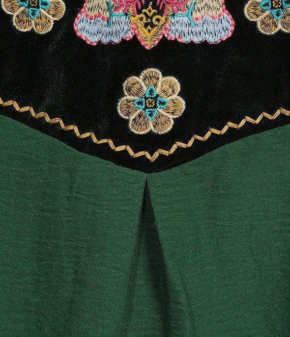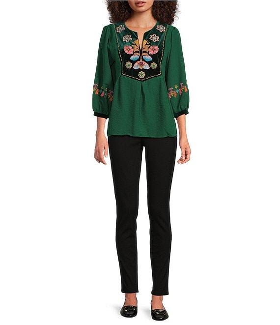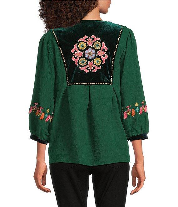 Calessa Embroidered Patchwork Print Round Split V-Neck 3/4 Sleeve Tunic