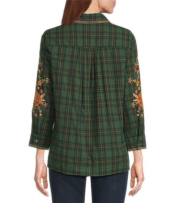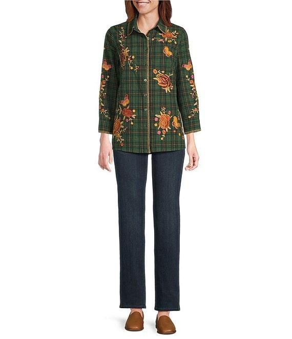 Calessa Floral Embroidered Crinkle Woven Point Collar Long Sleeve Button Front Shirt