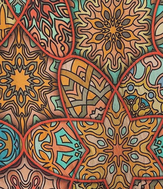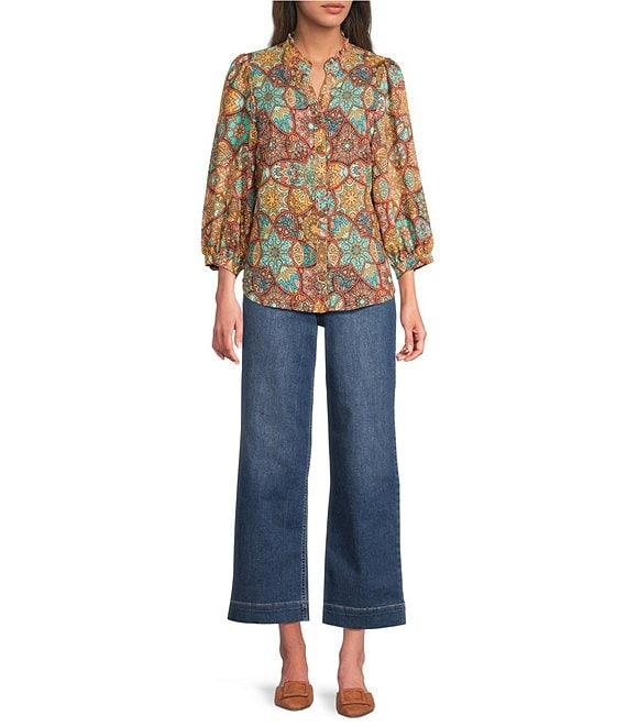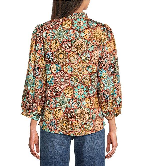 Calessa Mosaic Patchwork Print High Split V-Neck 3/4 Sleeve Button Front Shirt