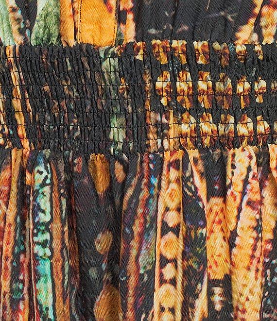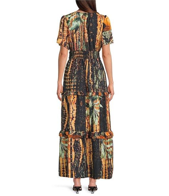 From Calessa, this dress features: Comfort stretch fabrication A-line silhouette Split v-neckline Cap flutter sleeves Autumn floral print Smocked back belt Tiered long skirt Straight hemline Pullover construction Approx. 50" length Polyester Hand wash cold/line dry Imported.