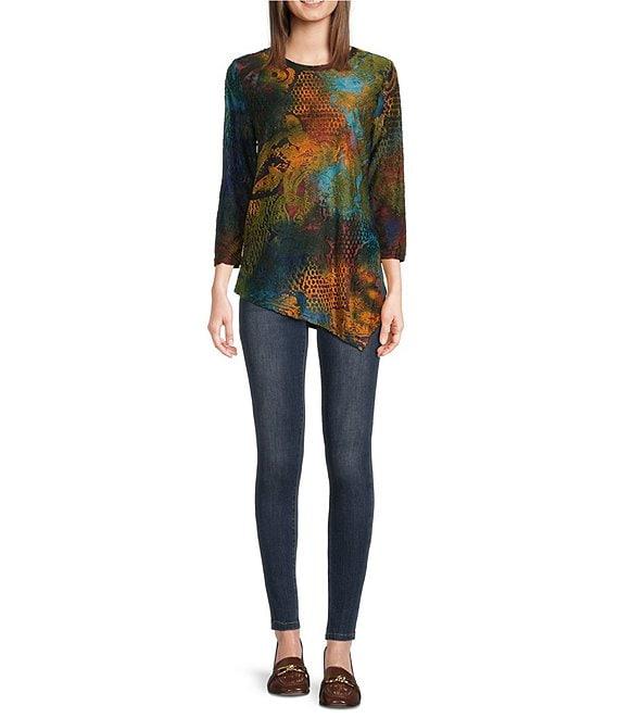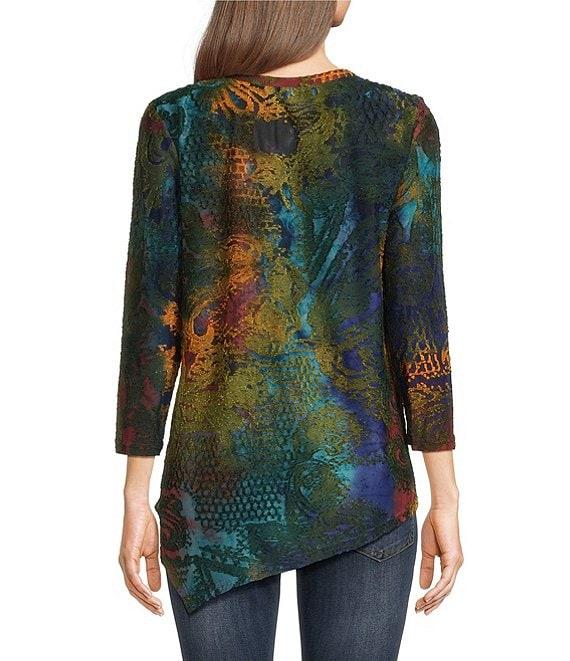 Calessa Petite Size Burnout Knit Tie-Dye Crew Neck 3/4 Sleeve Asymmetric Hem Tunic