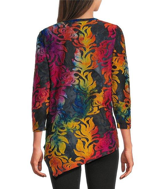 Calessa Petite Size Burnout Tie-Dye Print Crew Neck 3/4 Sleeve Asymmetric Hem Tunic