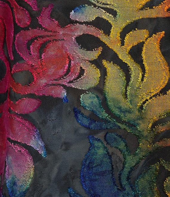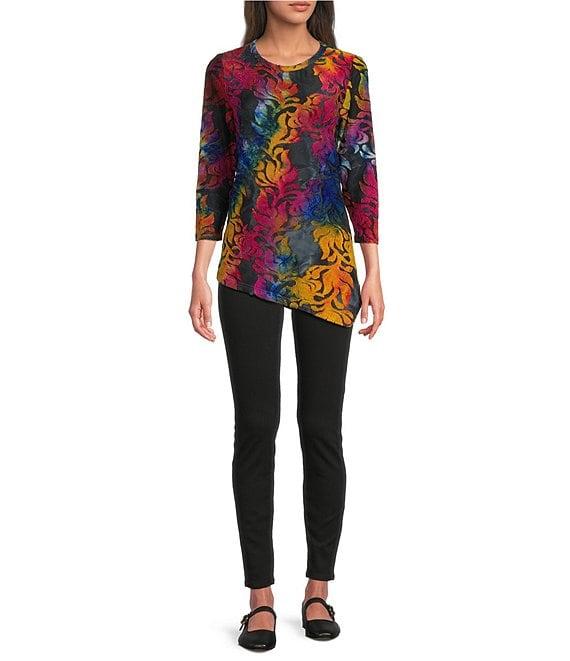 From Calessa, this tunic features: Burnout fabrication Crew neckline 3/4 sleeves Tie-dye print Asymmetric hemline Pullover construction Approx. 29.5" length Polyester/spandex Hand wash/line dry Imported.