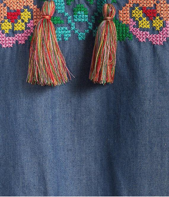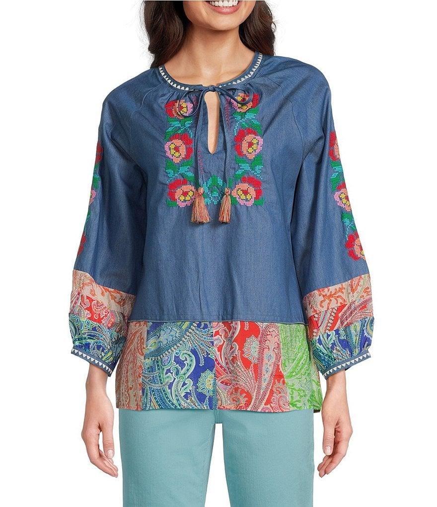 Calessa Petite Size Embroidered Border Patchwork Tassel Tie Keyhole Neck Wrist Length Sleeve Tunic