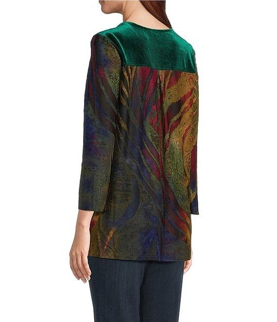 From Calessa Petite, this tunic features: Velvet knit fabrication V-neckline Bracelet length sleeves Comfort fit Embroidered with burnout tie-dye sleeves Straight hem Pullover construction Approx. 28" length Polyester/spandex Hand wash/line dry Imported.