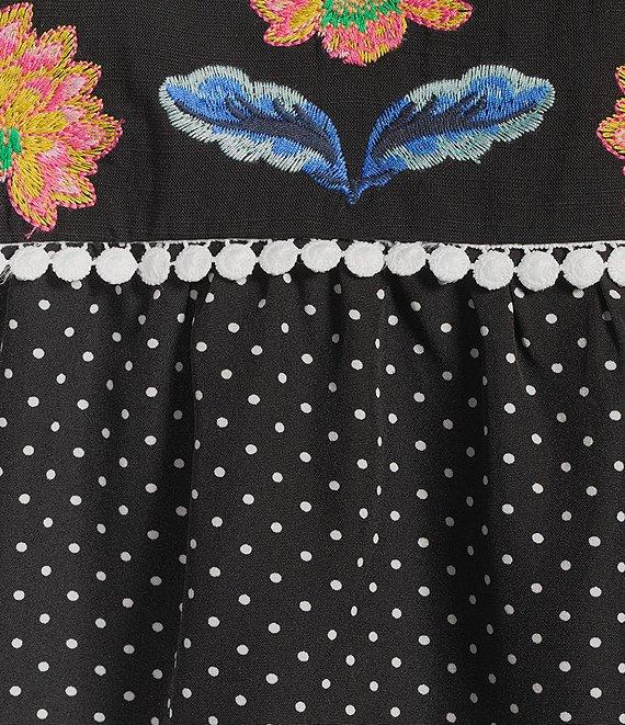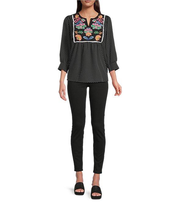 Calessa Petite Size Embroidered Dot Floral Round Split V-Neck 3/4 Sleeve Tunic