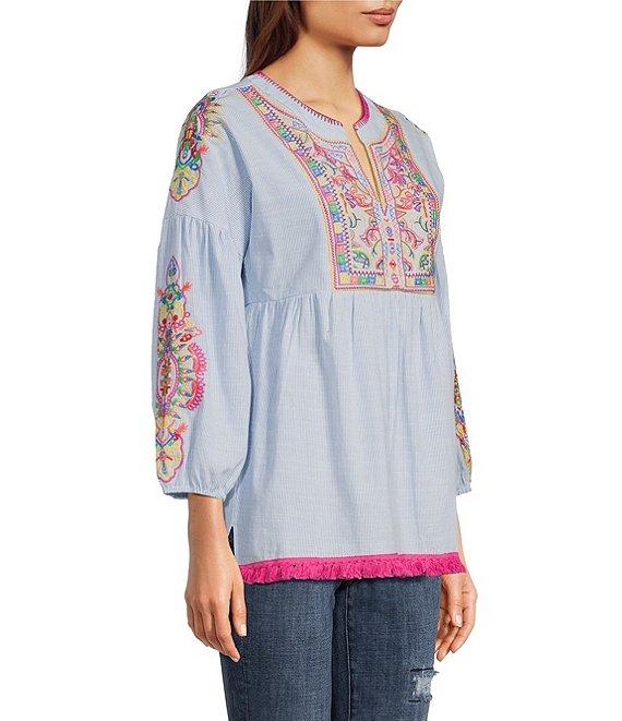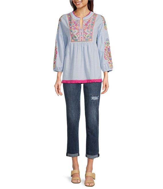 Calessa Petite Size Embroidered Patchwork Split Round V-Neck Bracelet Sleeve Tunic