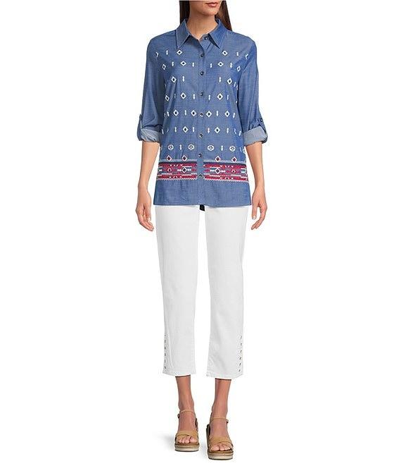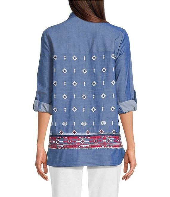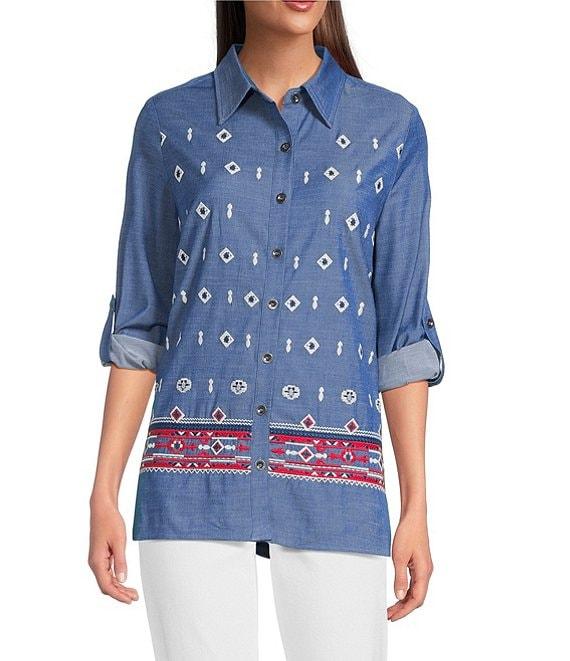 Calessa Petite Size Embroidered Point Collar Long Roll-Tab Sleeve Button Front Tunic
